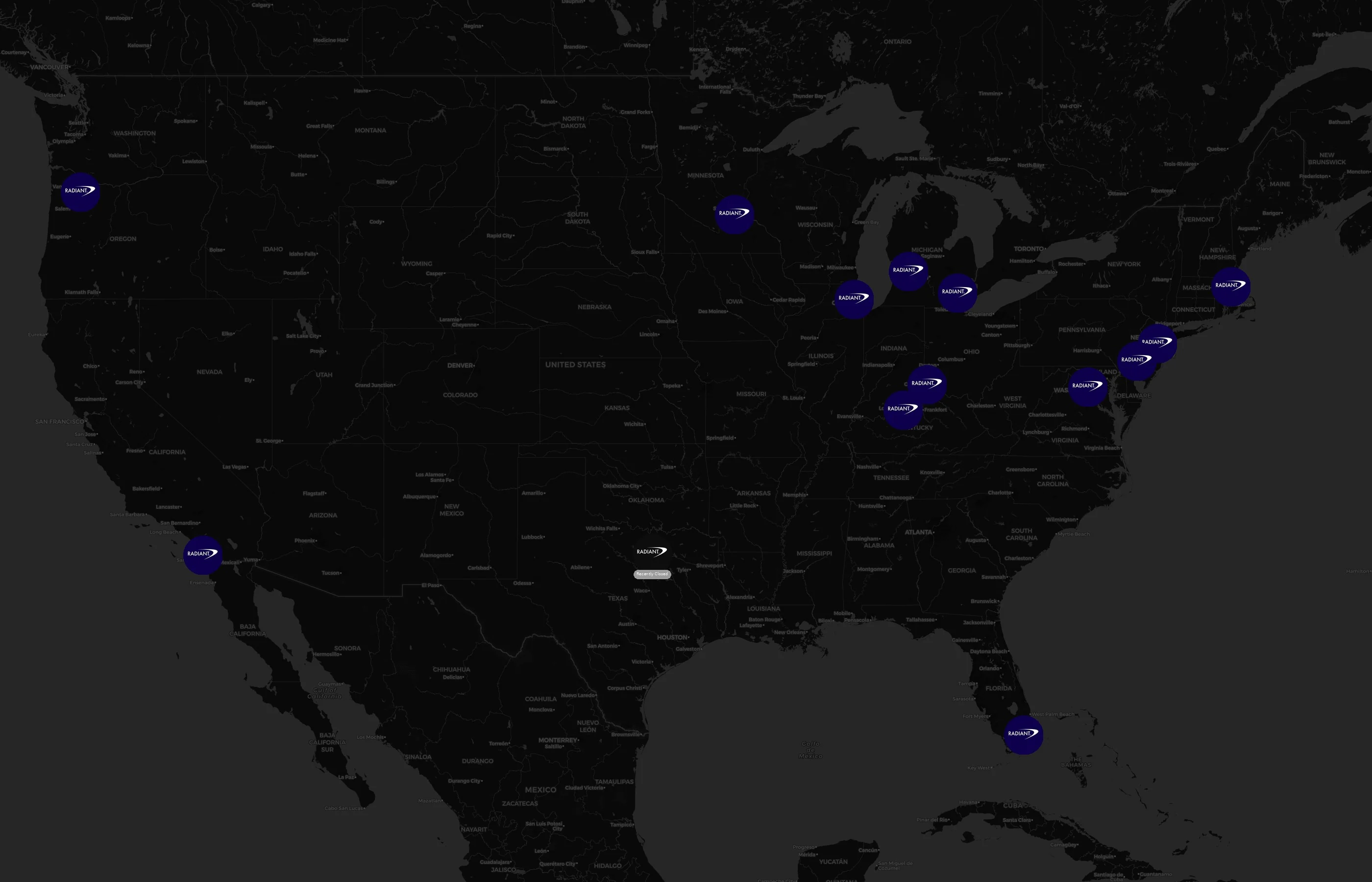 Locations concentrate around major metros such as Boone, Clackamas, Dakota, Dallas, and Delaware. The top 10 cities account for 71.4% of U.S. sites.