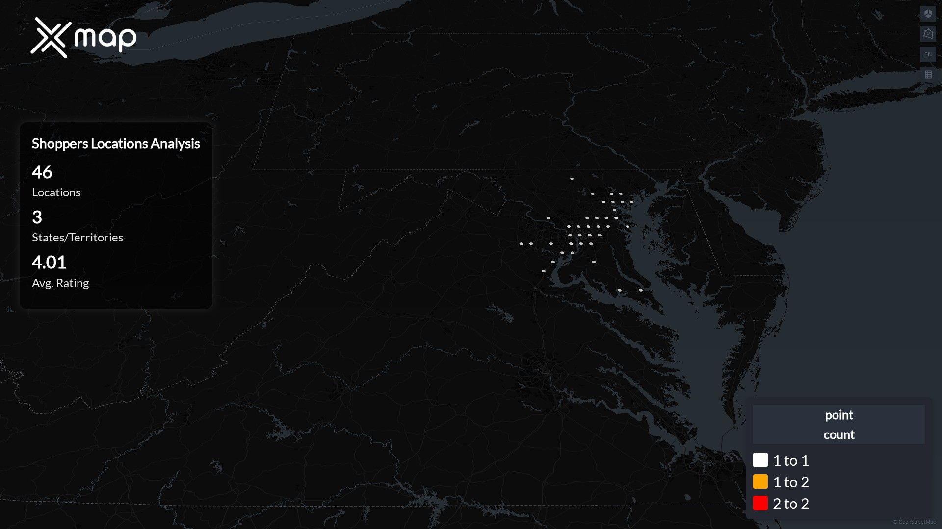 Shoppers POI data enables clear measurement of footprint and demand. Analysts can rank states and cities by location count, compare coverage on a per-capita basis, and use traffic scores and review volumes to spot high-performing markets and under-served pockets. The result is an objective view of saturation, growth opportunities, and performance outliers.