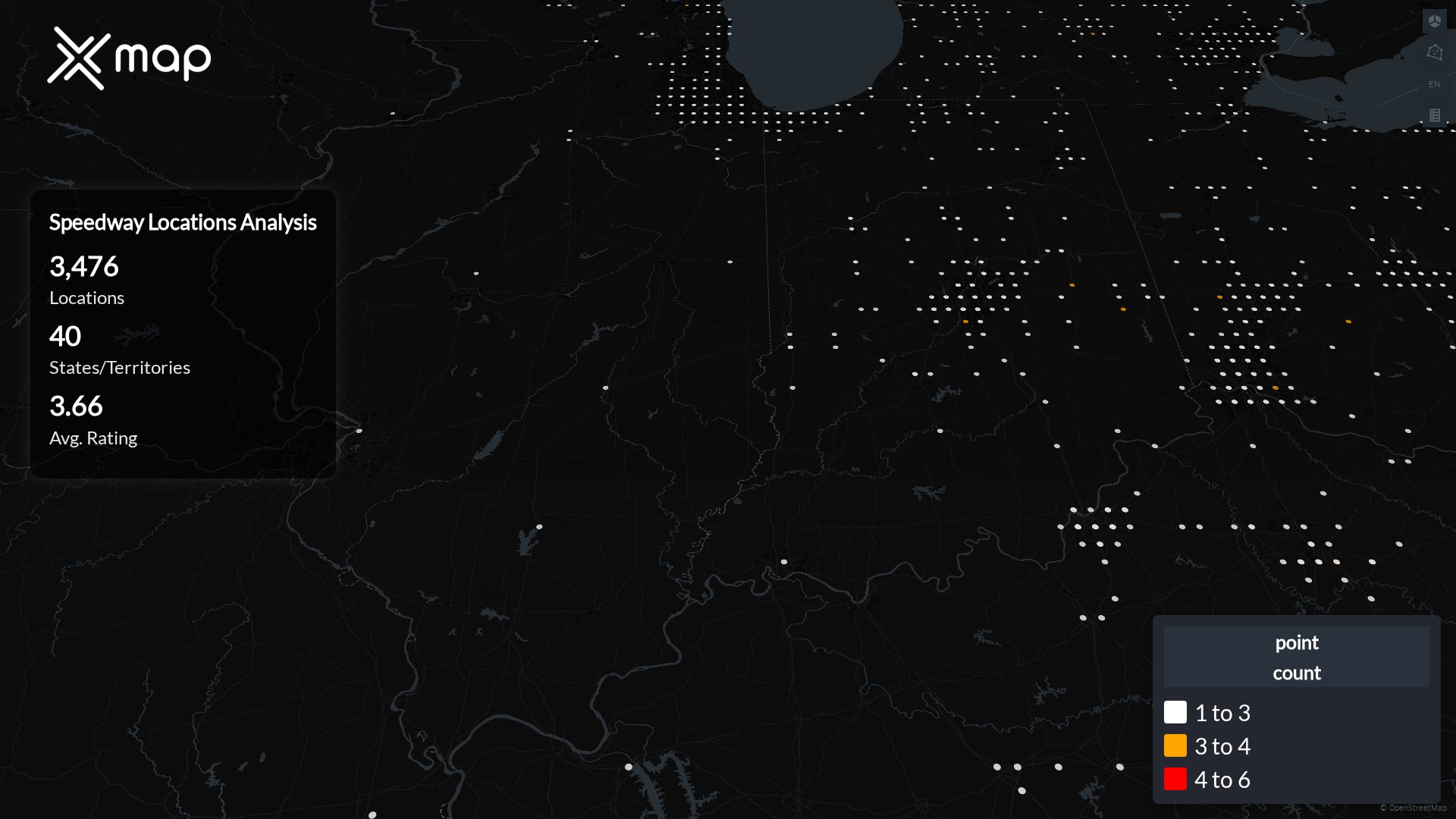 Street-level clusters show corridors where multiple Speedway locations sit within the same neighborhood indicating strong local presence and coherence. Speedway operates a total of 3476 nationwide.