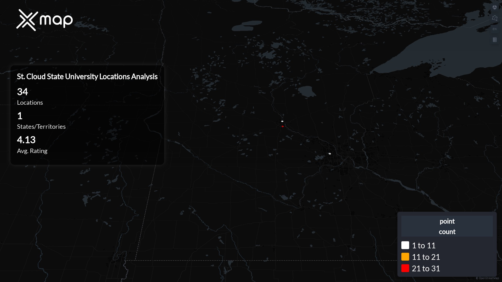 St. Cloud State University operates 34 United States of America locations across 1 states. Largest clusters are in Minnesota; the top 10 states contain 100.0% of sites. Coverage is thinner in Minnesota.