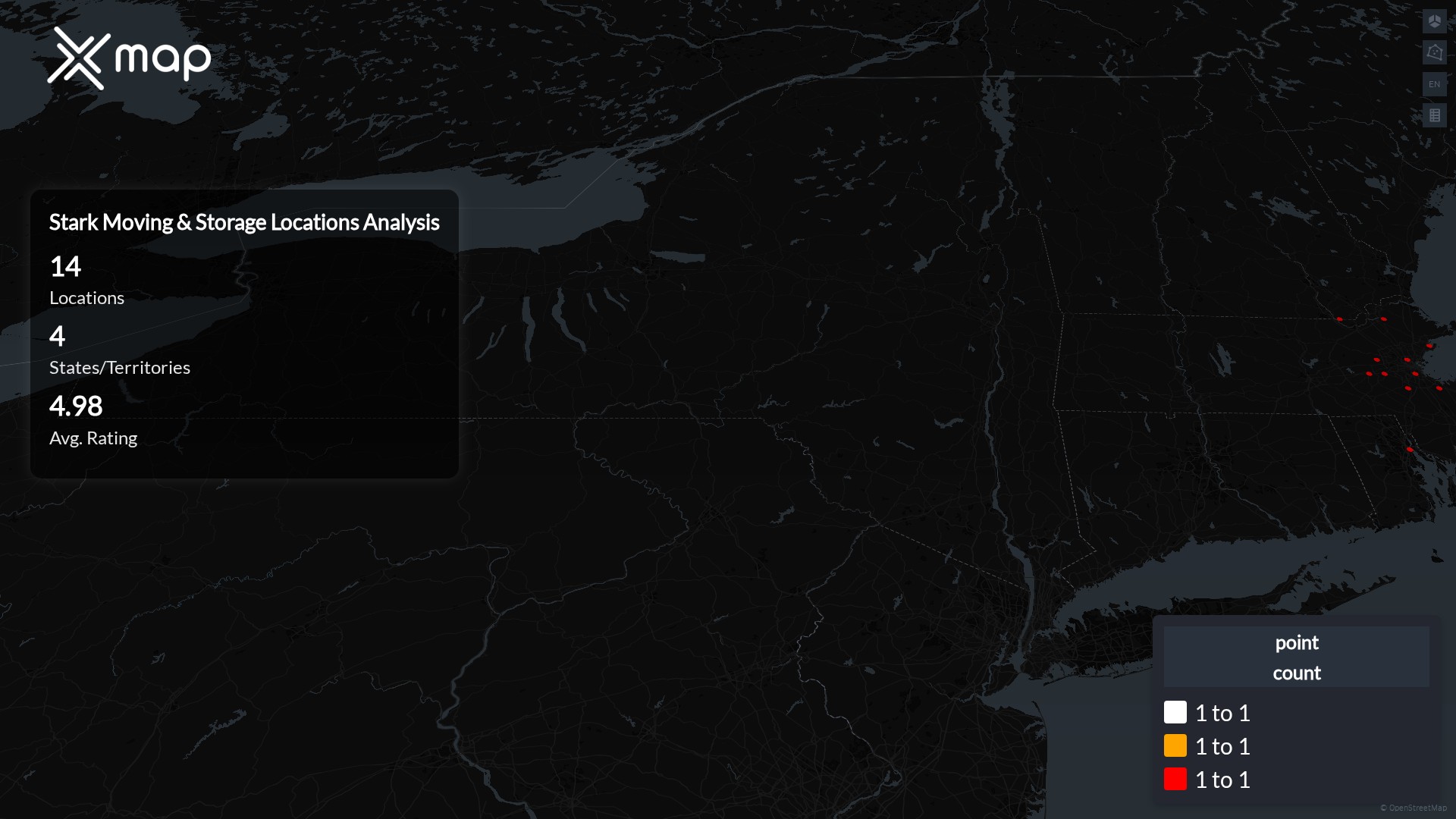 Street-level clusters show corridors where multiple Stark Moving & Storage locations sit within the same neighborhood indicating strong local presence and coherence. Stark Moving & Storage operates a total of 14 nationwide.