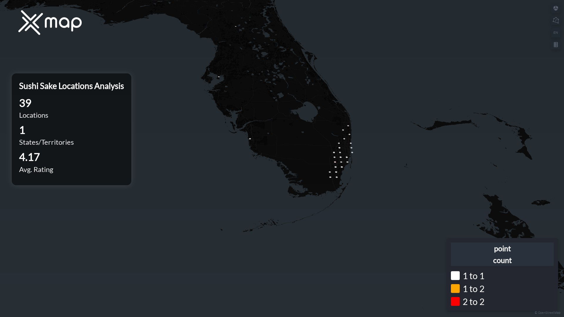 Sushi Sake operates a total of 39 locations exclusively in Florida, representing 100% of its presence in the United States. Florida accounts for the entire share of the top three and top ten states by location count. Each location in Florida serves approximately 554,732 people, marking it as both the best accessed and most stretched state for the brand.