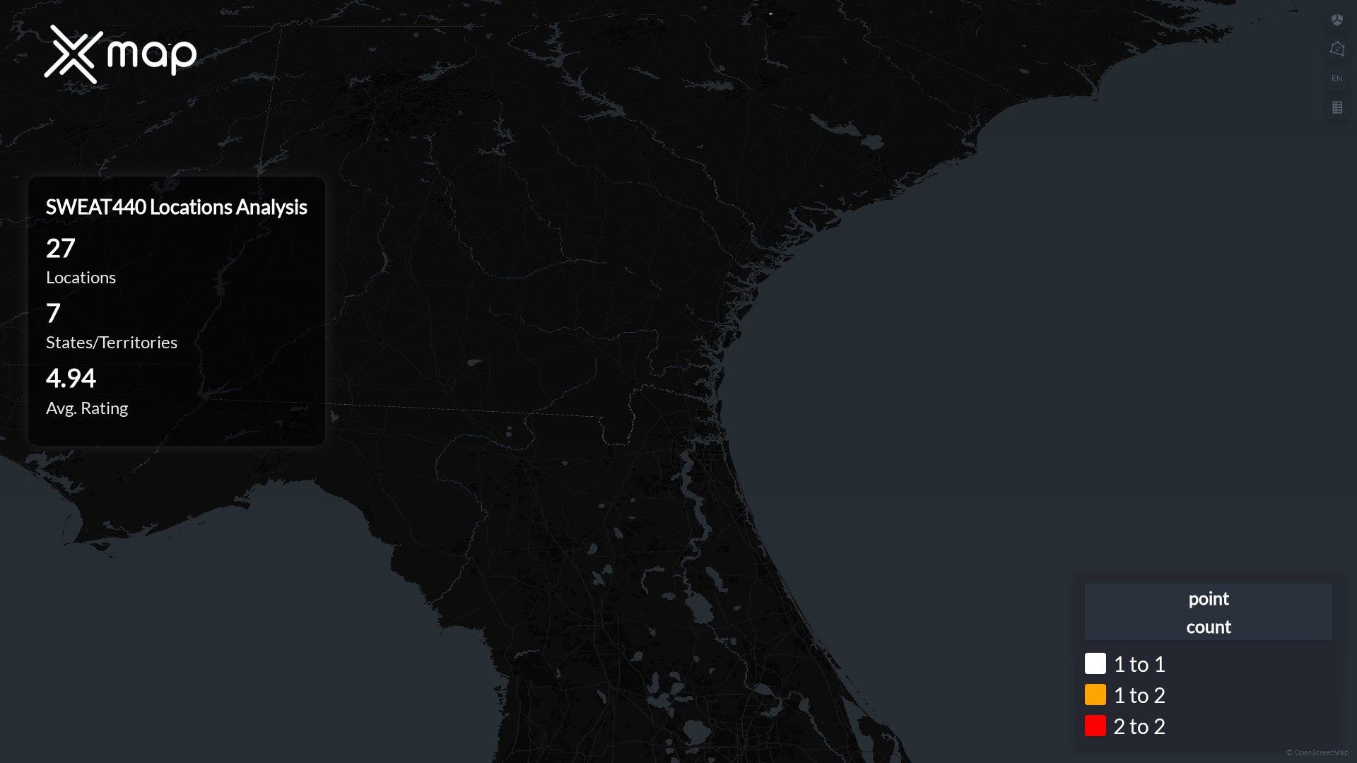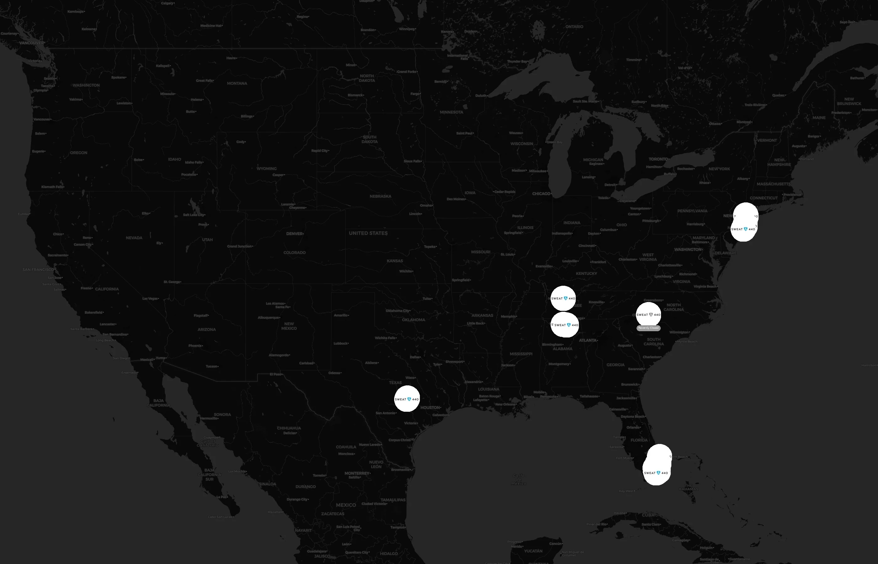 Street-level clusters show corridors where multiple SWEAT440 locations sit within the same neighborhood indicating strong local presence and coherence. SWEAT440 operates a total of 27 nationwide.