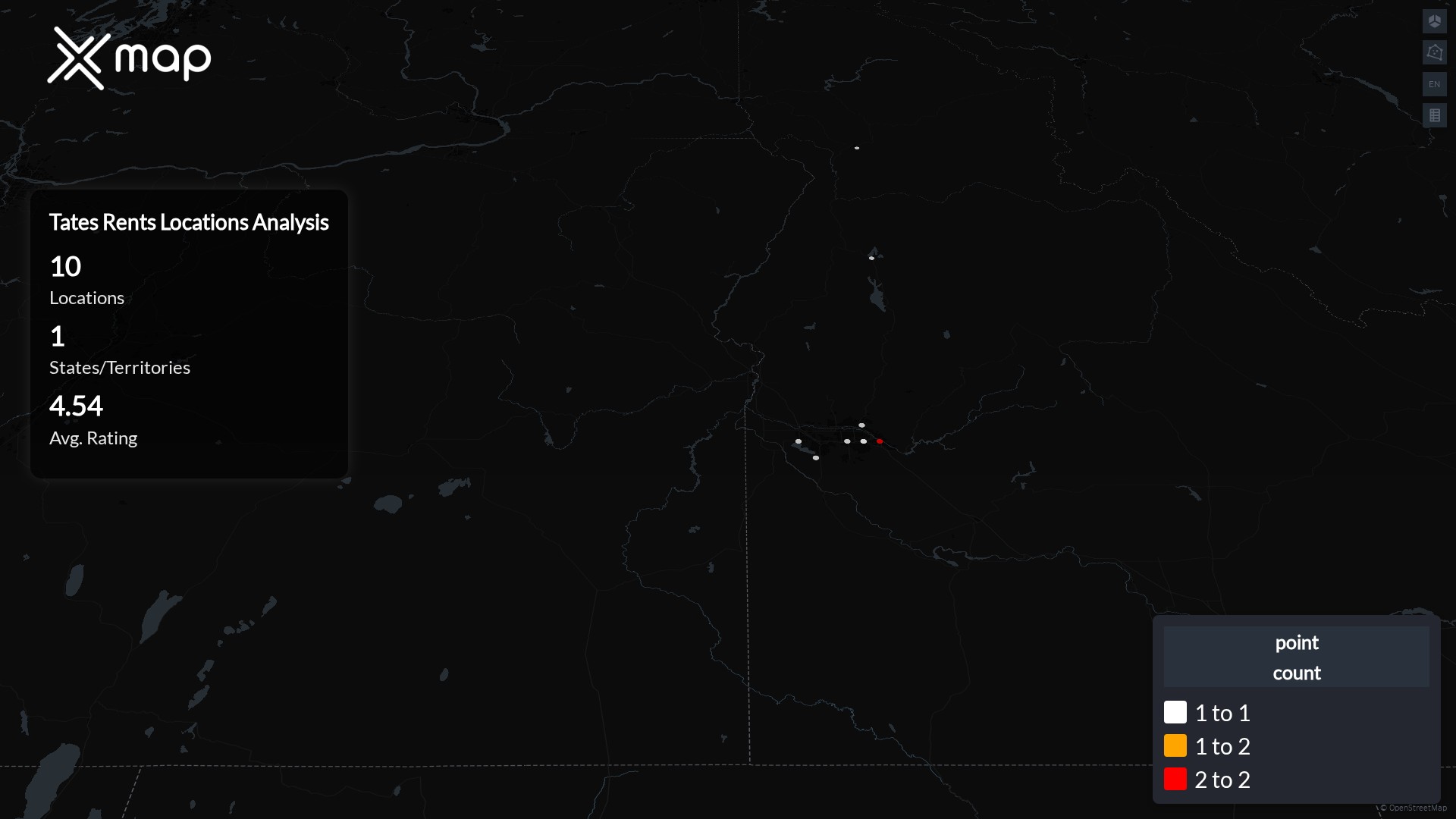 Tates Rents POI data enables clear measurement of footprint and demand. Analysts can rank states and cities by location count, compare coverage on a per-capita basis, and use traffic scores and review volumes to spot high-performing markets and under-served pockets. The result is an objective view of saturation, growth opportunities, and performance outliers.
