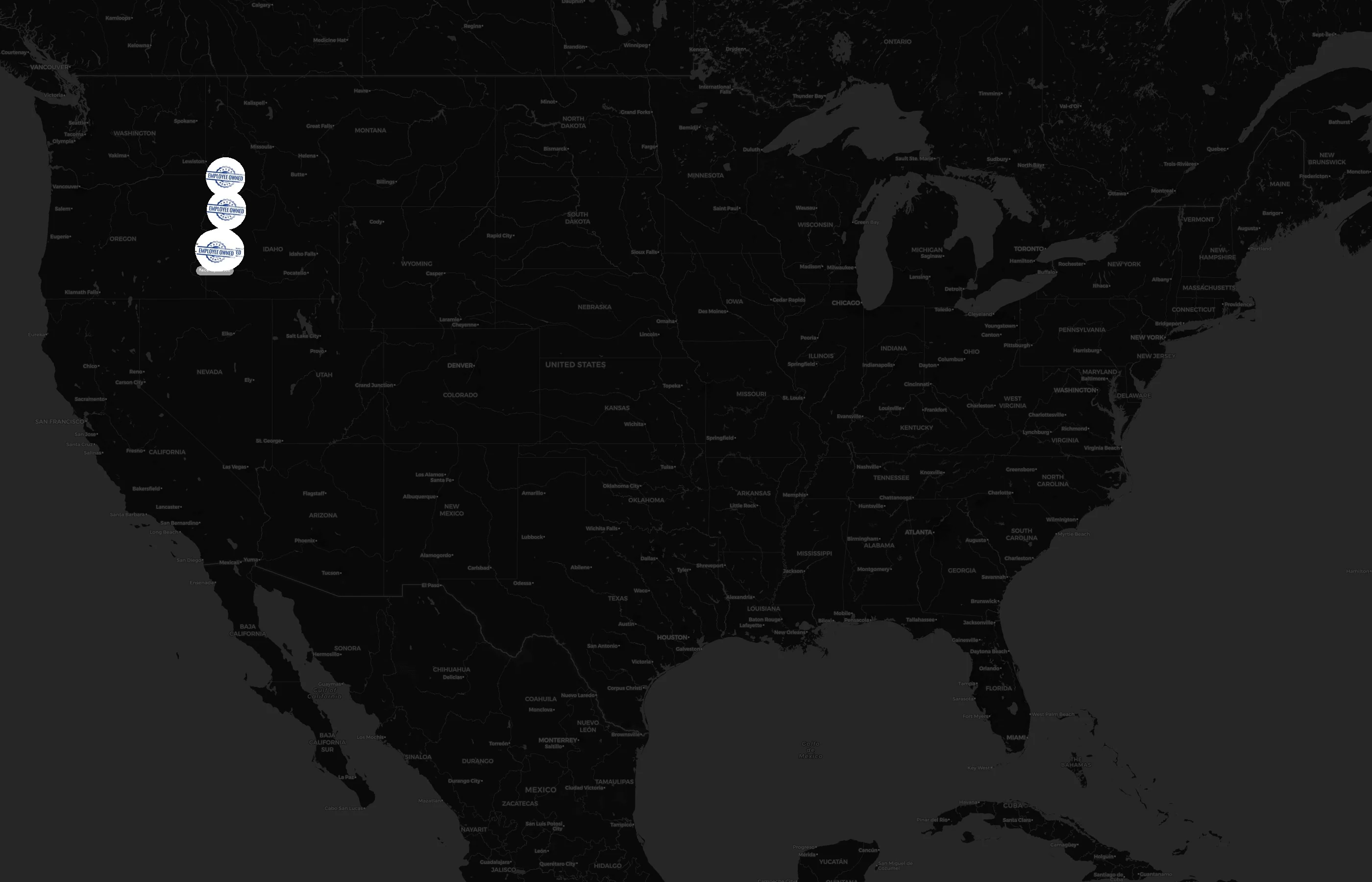 Locations concentrate around major metros such as Ada, Canyon, Idaho, and Valley. The top 10 cities account for 100.0% of U.S. sites.