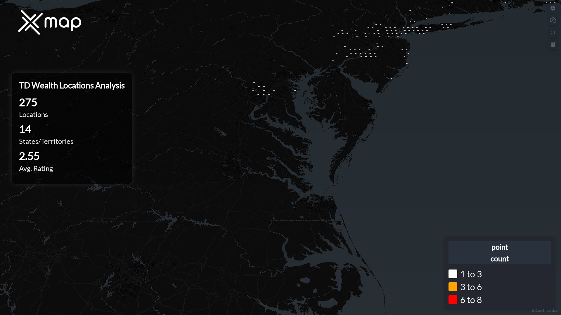 Street-level clusters show corridors where multiple TD Wealth locations sit within the same neighborhood indicating strong local presence and coherence. TD Wealth operates a total of 275 nationwide.
