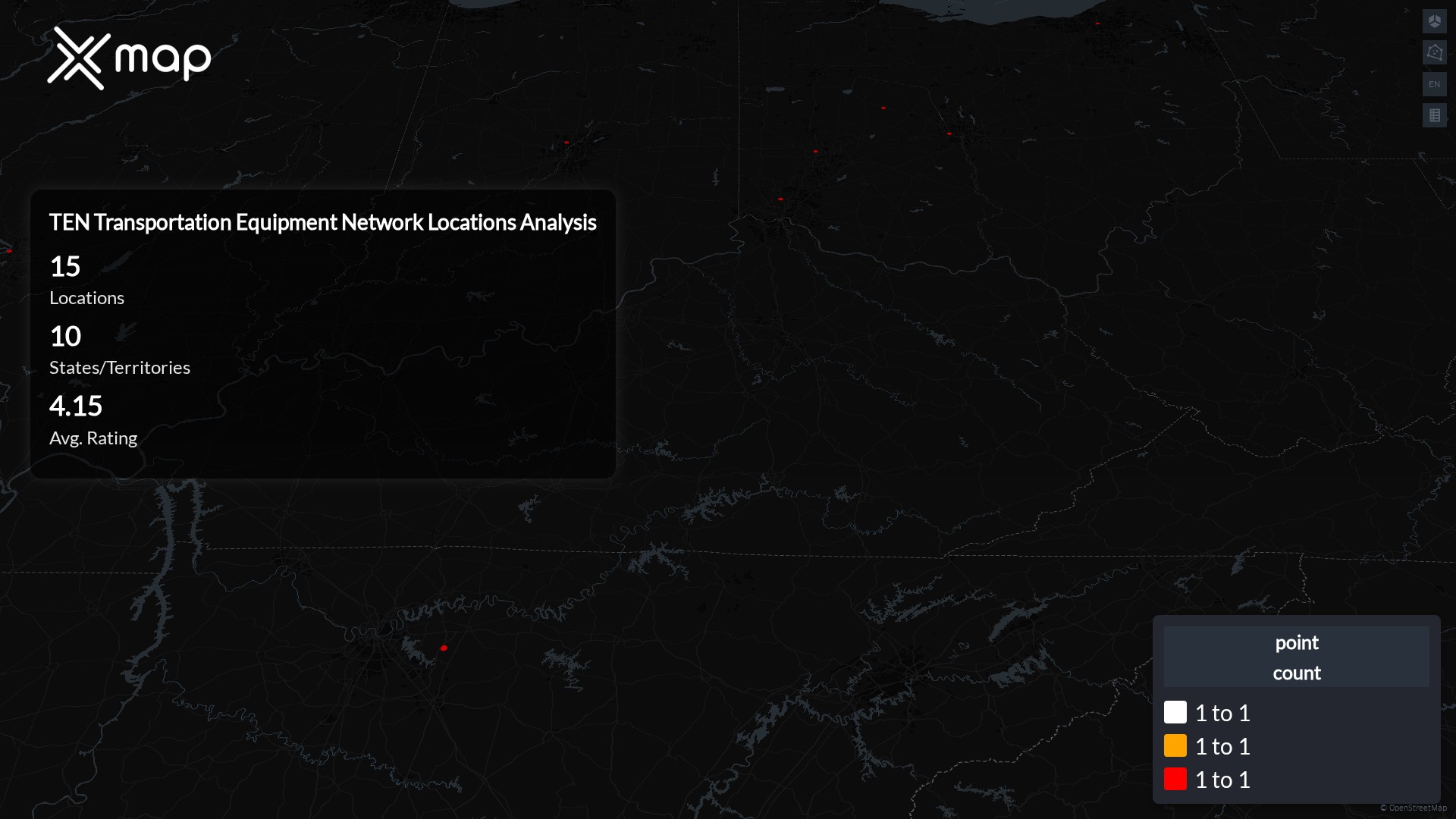 TEN Transportation Equipment Network POI data enables clear measurement of footprint and demand. Analysts can rank states and cities by location count, compare coverage on a per-capita basis, and use traffic scores and review volumes to spot high-performing markets and under-served pockets. The result is an objective view of saturation, growth opportunities, and performance outliers.