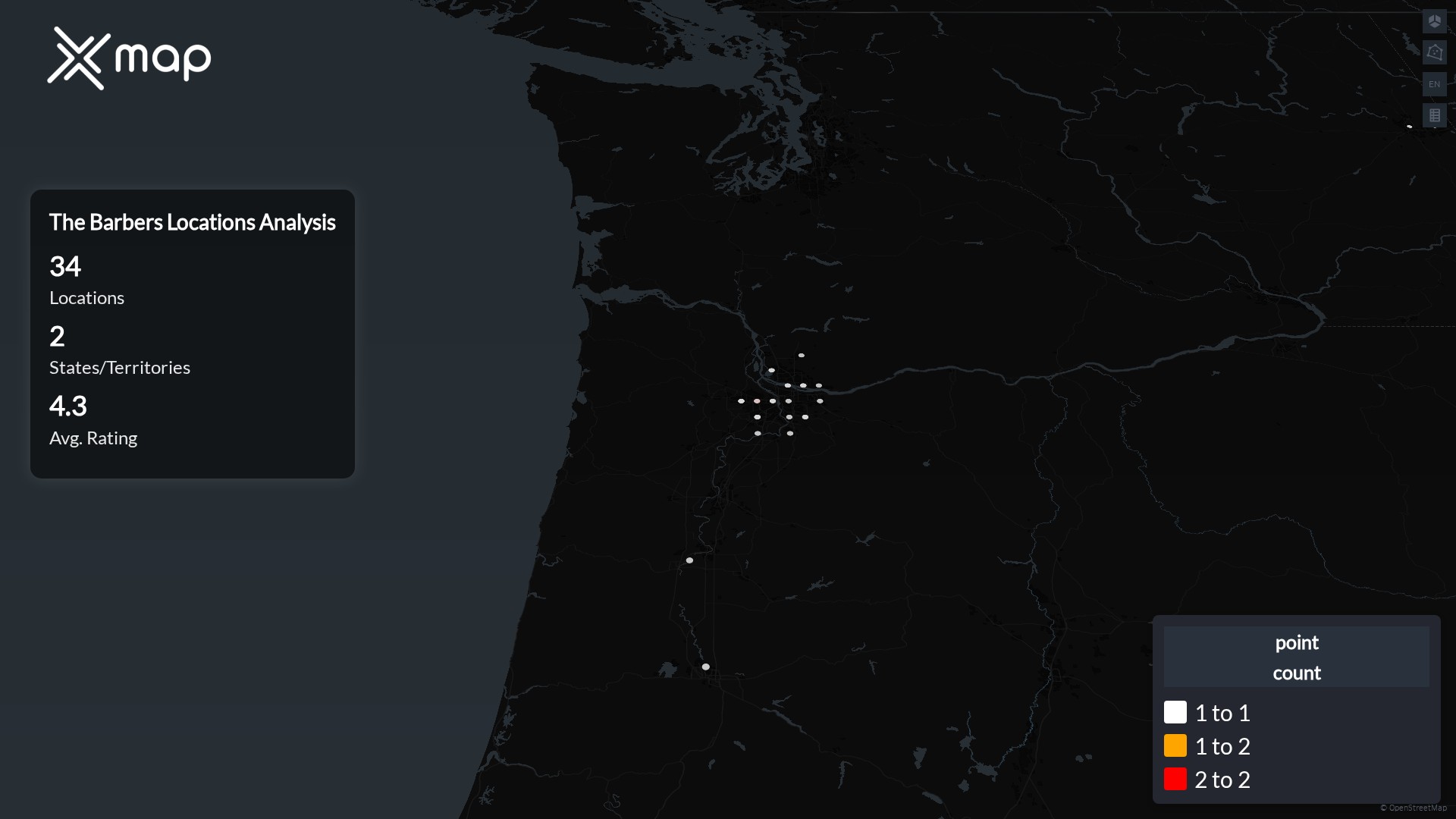 Street-level clusters show corridors where multiple The Barbers locations sit within the same neighborhood indicating strong local presence and coherence. The Barbers operates a total of 34 nationwide.