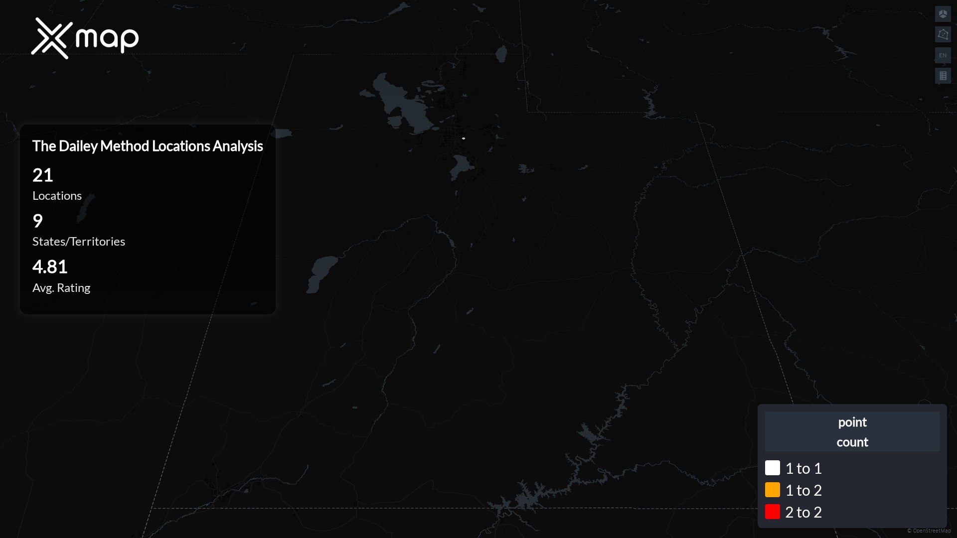 The Dailey Method POI data enables clear measurement of footprint and demand. Analysts can rank states and cities by location count, compare coverage on a per-capita basis, and use traffic scores and review volumes to spot high-performing markets and under-served pockets. The result is an objective view of saturation, growth opportunities, and performance outliers.