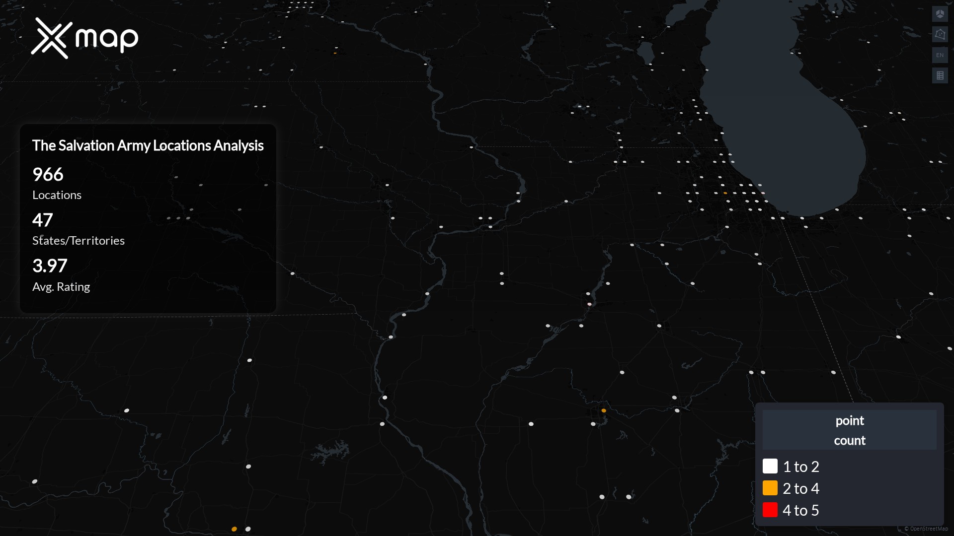 Street-level clusters show corridors where multiple The Salvation Army locations sit within the same neighborhood indicating strong local presence and coherence. The Salvation Army operates a total of 966 nationwide.