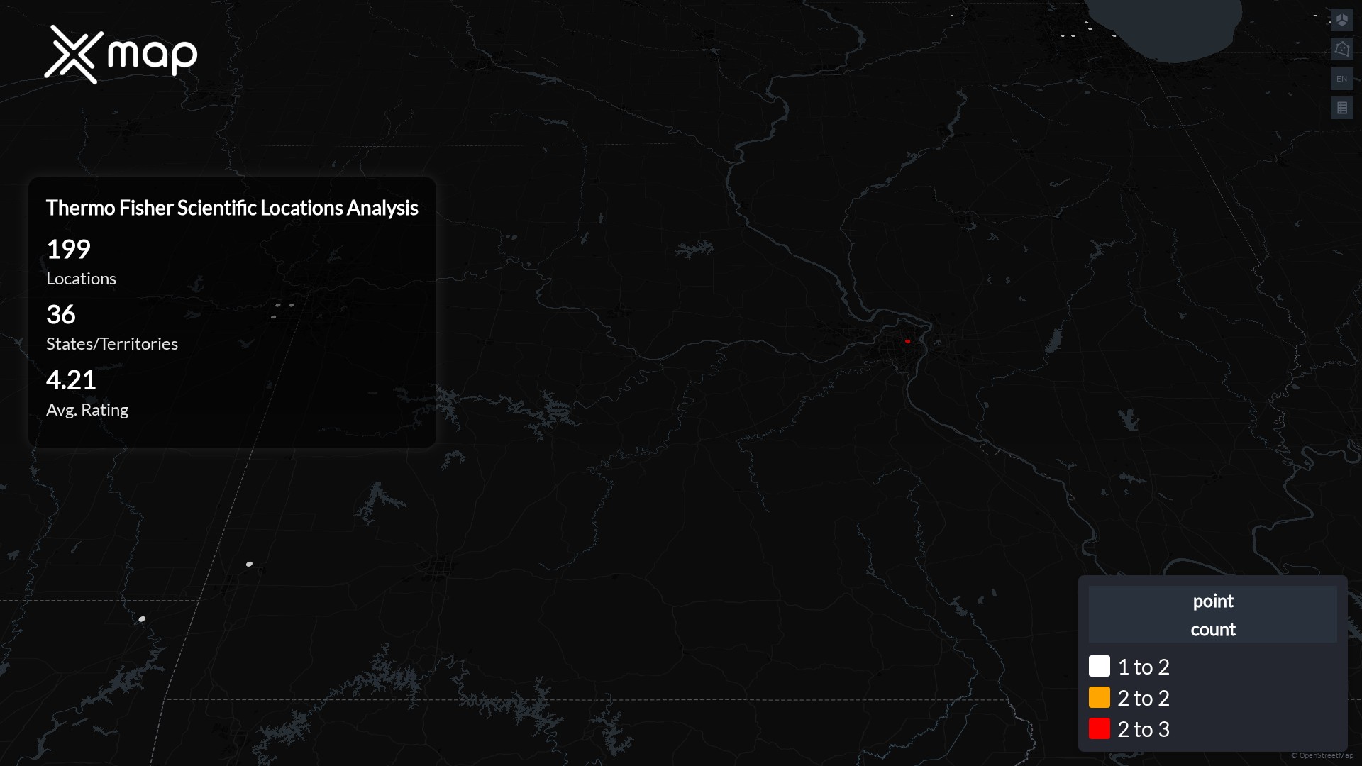 Thermo Fisher Scientific POI data enables clear measurement of footprint and demand. Analysts can rank states and cities by location count, compare coverage on a per-capita basis, and use traffic scores and review volumes to spot high-performing markets and under-served pockets. The result is an objective view of saturation, growth opportunities, and performance outliers.