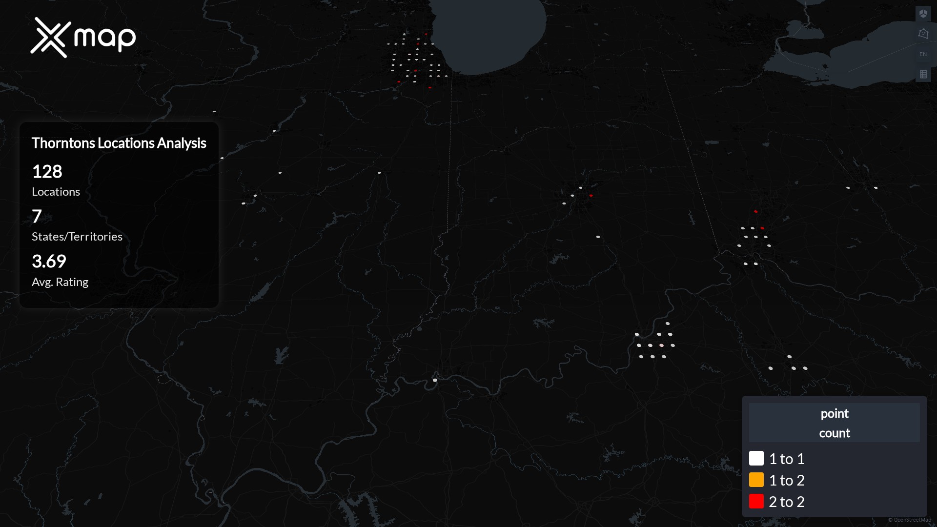 Street-level clusters show corridors where multiple Thorntons locations sit within the same neighborhood indicating strong local presence and coherence. Thorntons operates a total of 128 nationwide.