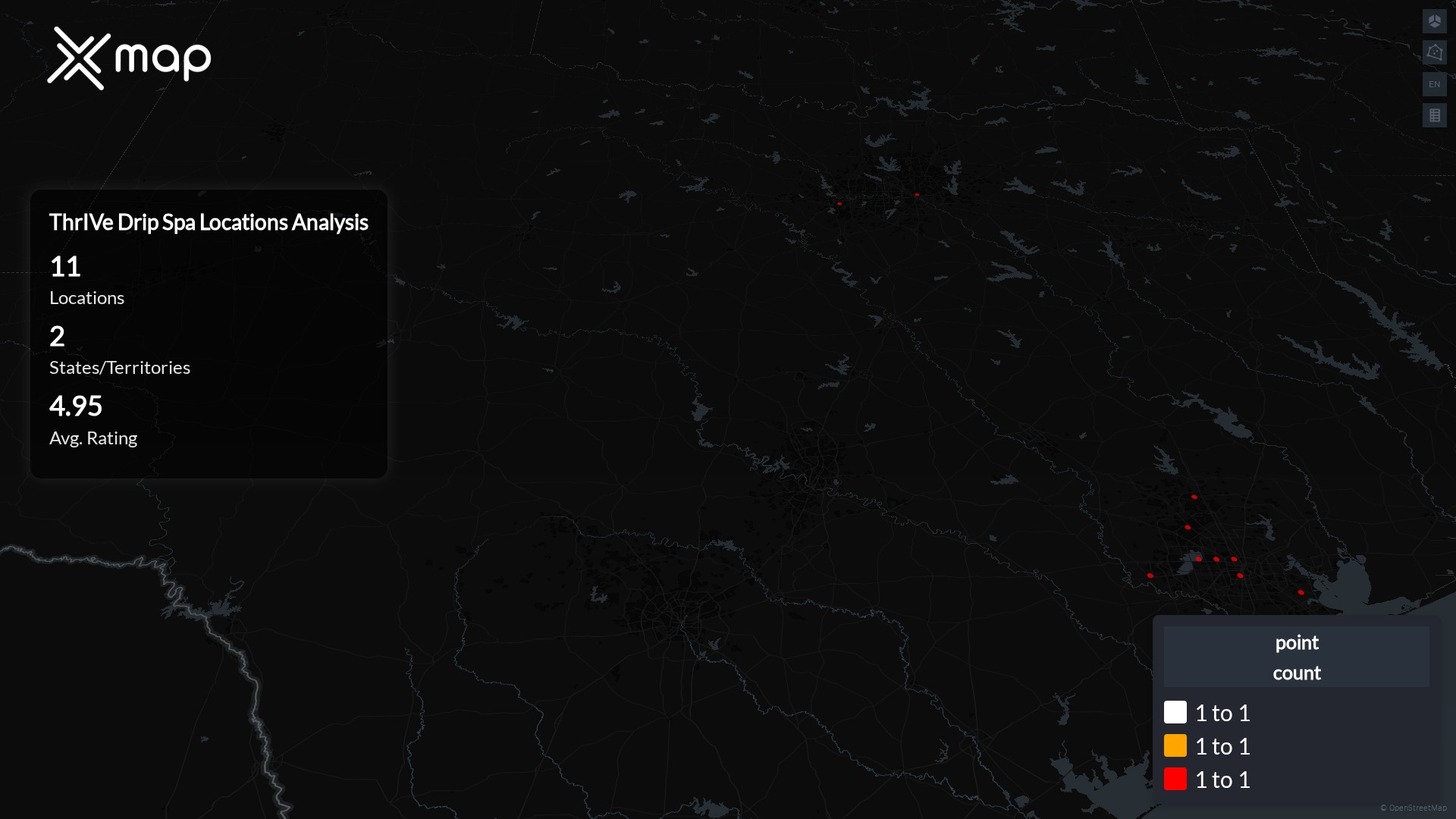 Street-level clusters show corridors where multiple ThrIVe Drip Spa locations sit within the same neighborhood indicating strong local presence and coherence. ThrIVe Drip Spa operates a total of 11 nationwide.