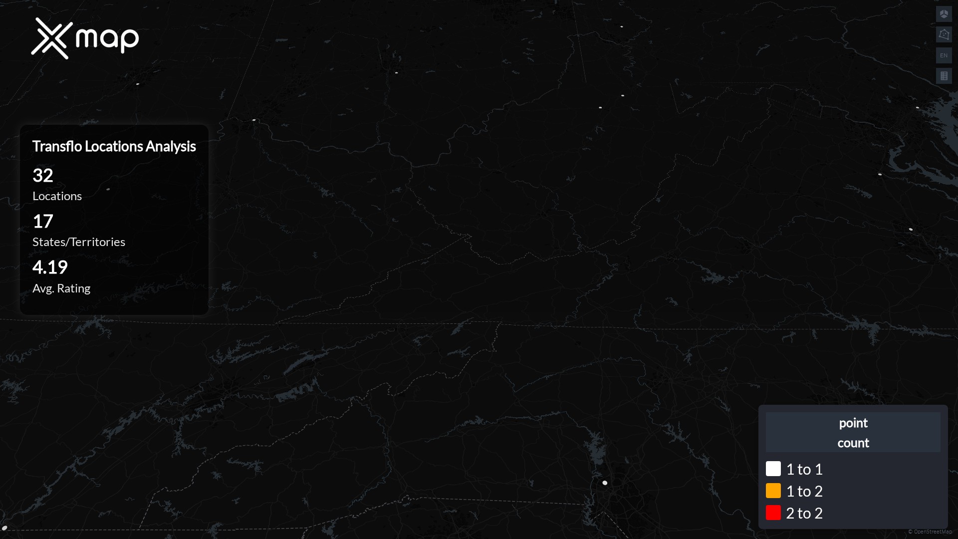 Street-level clusters show corridors where multiple Transflo locations sit within the same neighborhood indicating strong local presence and coherence. Transflo operates a total of 32 nationwide.