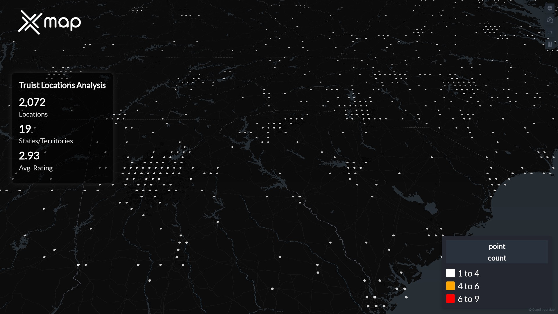 Truist POI data enables clear measurement of footprint and demand. Analysts can rank states and cities by location count, compare coverage on a per-capita basis, and use traffic scores and review volumes to spot high-performing markets and under-served pockets. The result is an objective view of saturation, growth opportunities, and performance outliers.