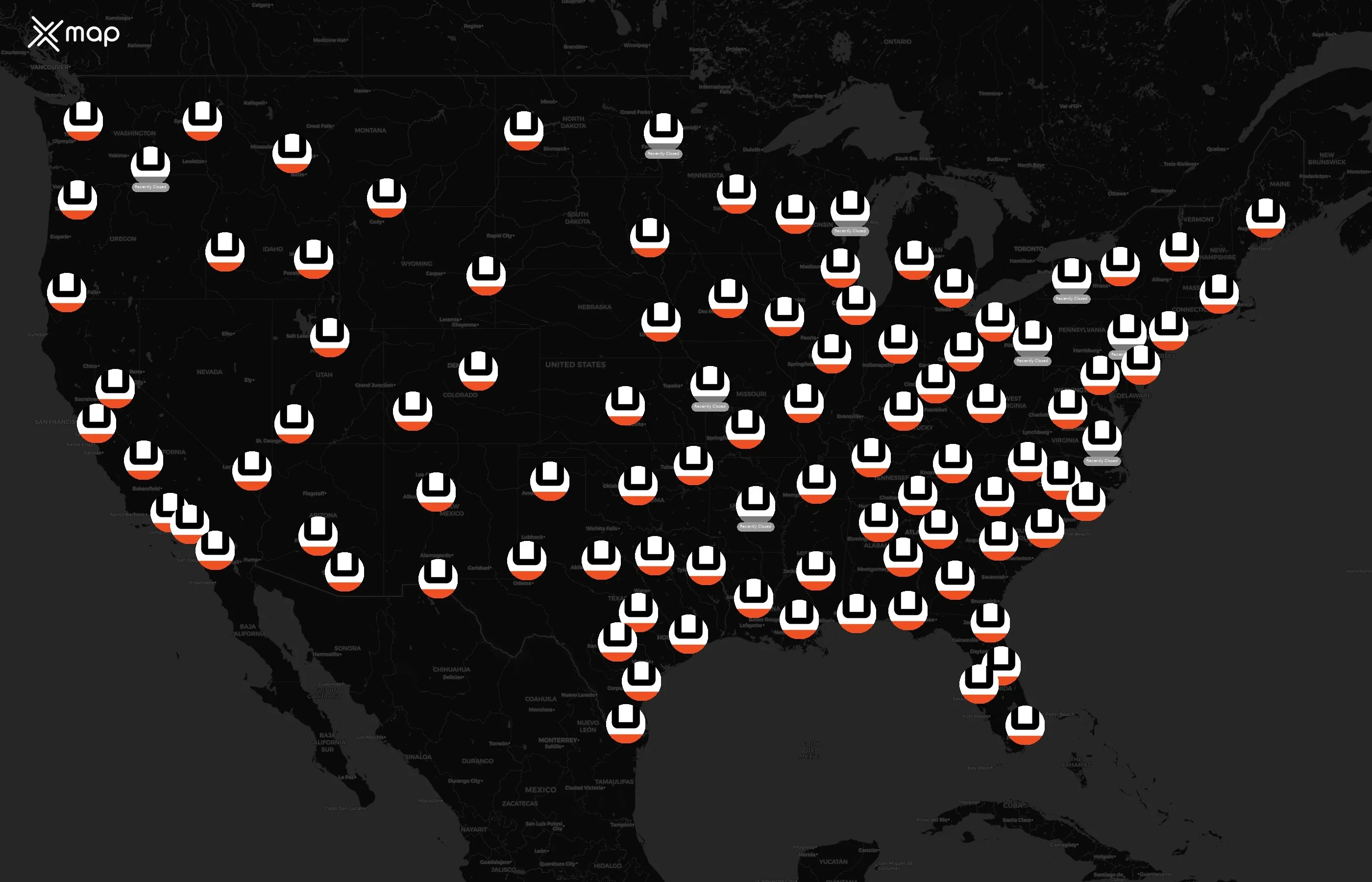 Locations concentrate around major metros such as Houston, Los Angeles, Chicago, New York, and Phoenix. The top 10 cities account for 4.7% of U.S. sites.