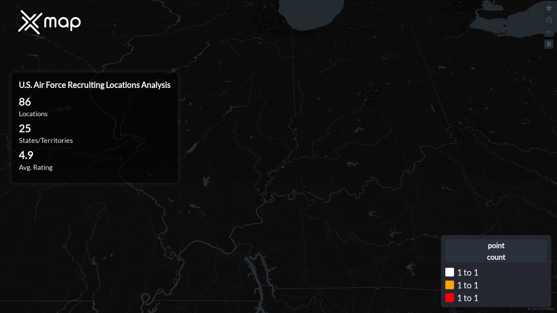 U.S. Air Force Recruiting has 86 locations across the United States of America. The key variables shows the most infleuntial aspects for U.S. Air Force Recruiting locations nationwide. This provides a closer look of how U.S. Air Force Recruiting is operating from different prespectives.