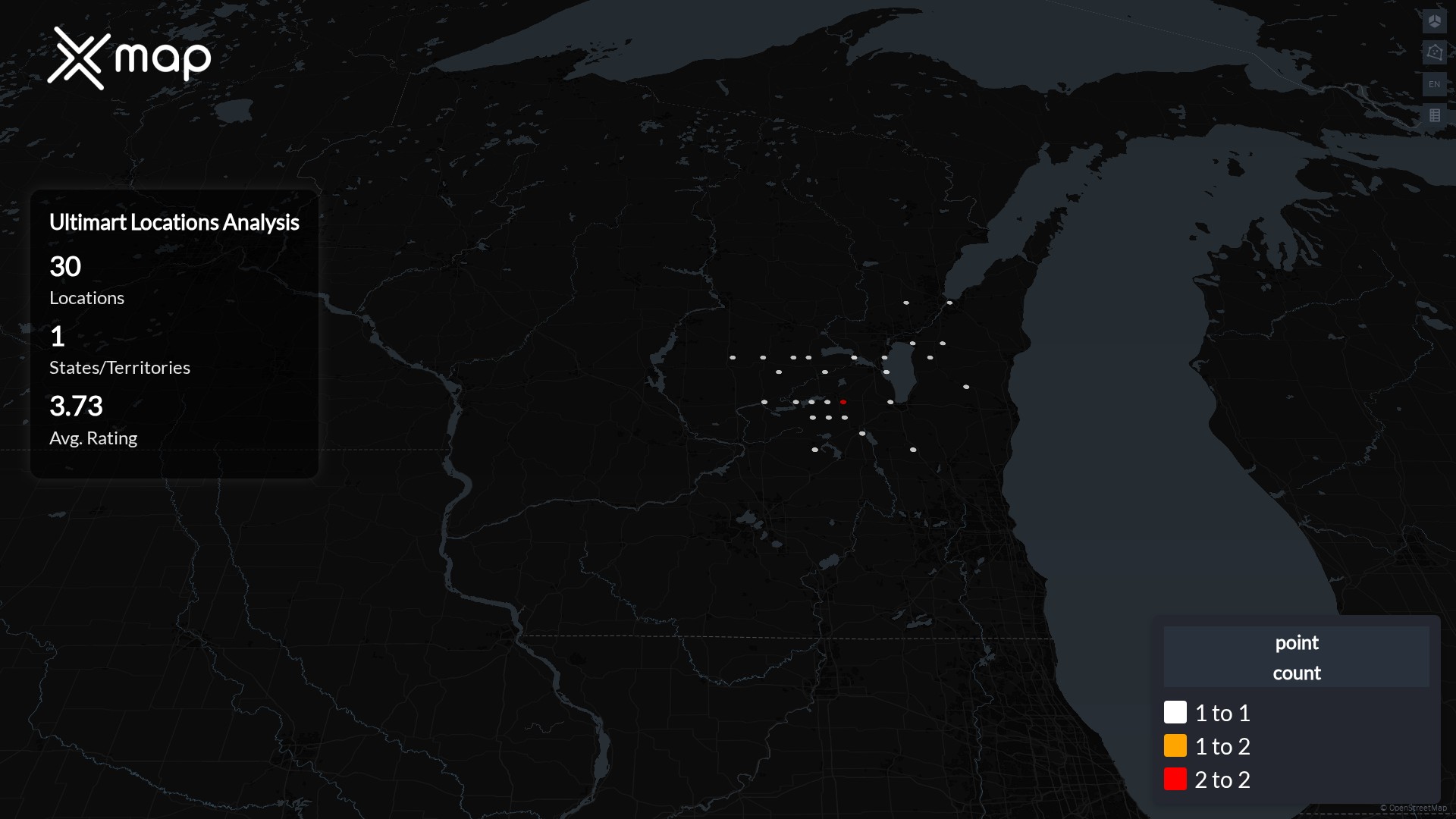 Ultimart operates 30 locations in Wisconsin, United States, with 29 stores open and only one closed. This reflects a high open rate of 96.7% for the brand in the state.