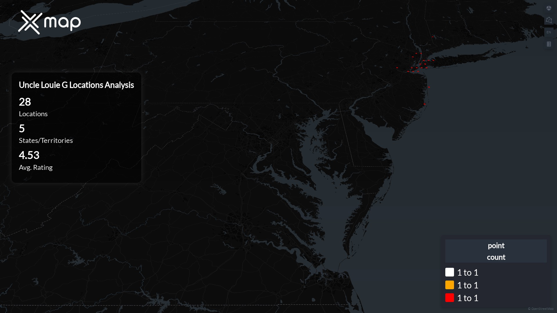 Street-level clusters show corridors where multiple Uncle Louie G locations sit within the same neighborhood indicating strong local presence and coherence. Uncle Louie G operates a total of 28 nationwide.