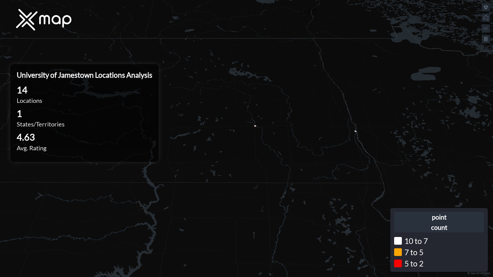University of Jamestown has 14 locations across the United States of America. The key variables shows the most infleuntial aspects for University of Jamestown locations nationwide. This provides a closer look of how University of Jamestown is operating from different prespectives.