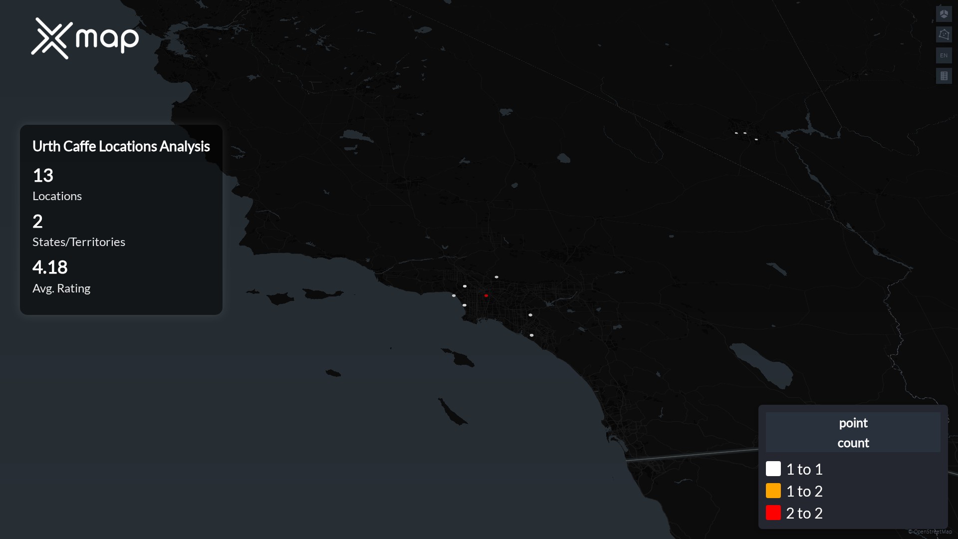 Street-level clusters show corridors where multiple Urth Caffe locations sit within the same neighborhood indicating strong local presence and coherence. Urth Caffe operates a total of 13 nationwide.