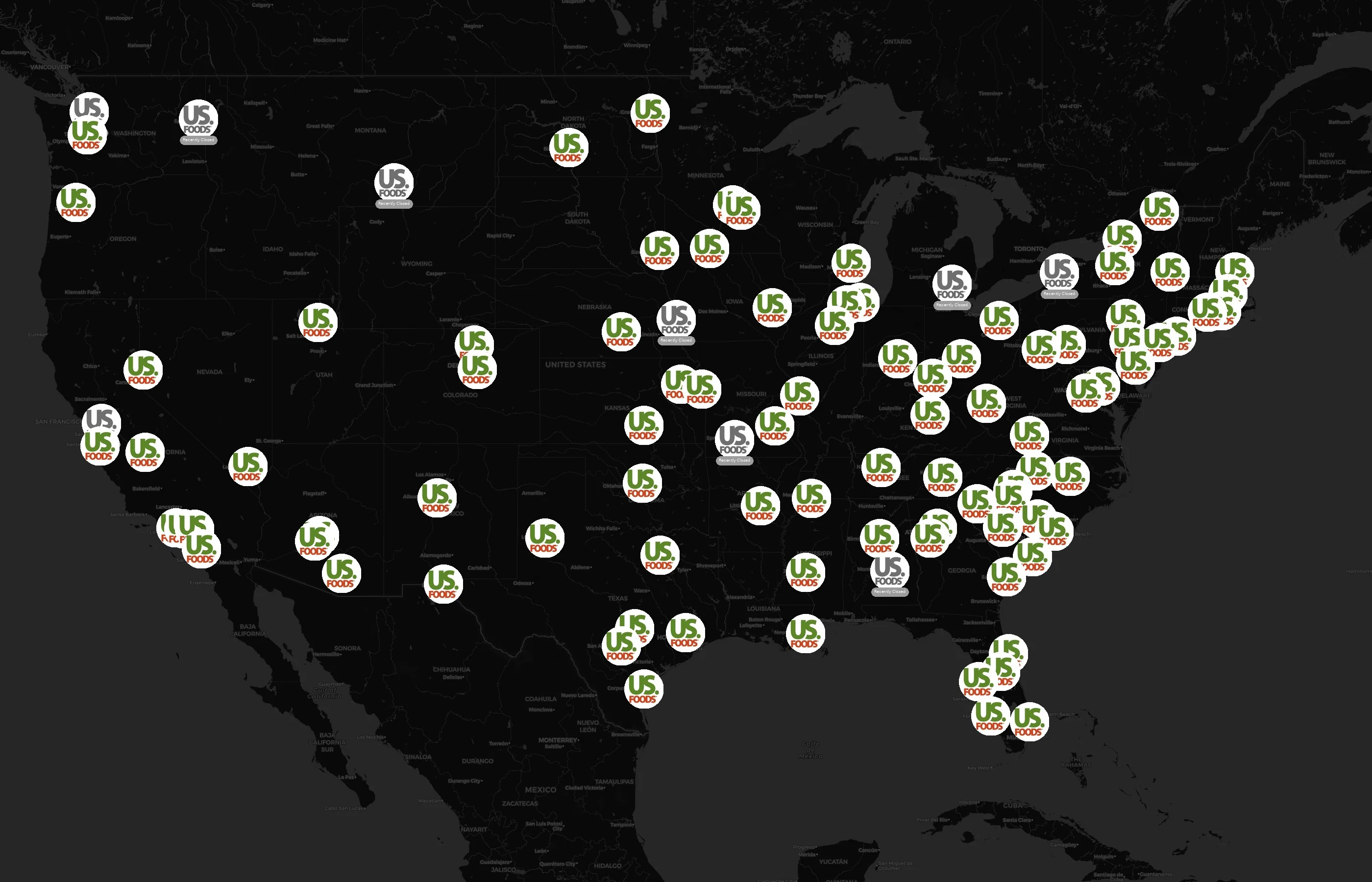 Street-level clusters show corridors where multiple US Foods locations sit within the same neighborhood indicating strong local presence and coherence. US Foods operates a total of 127 nationwide.