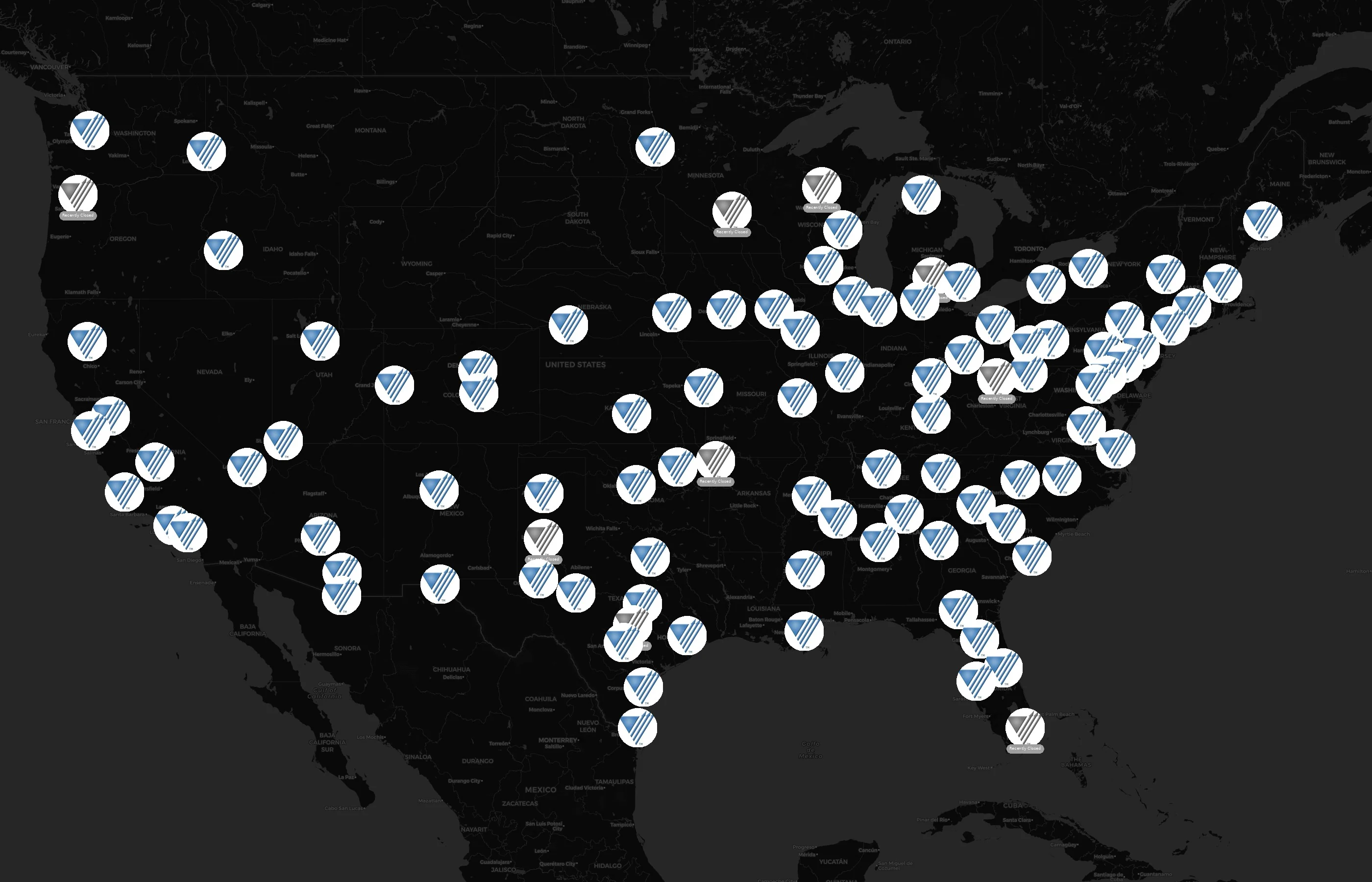 Locations concentrate around major metros such as LosAngeles, Tarrant, Bexar, Bell, and King. The top 10 cities account for 12.4% of U.S. sites.