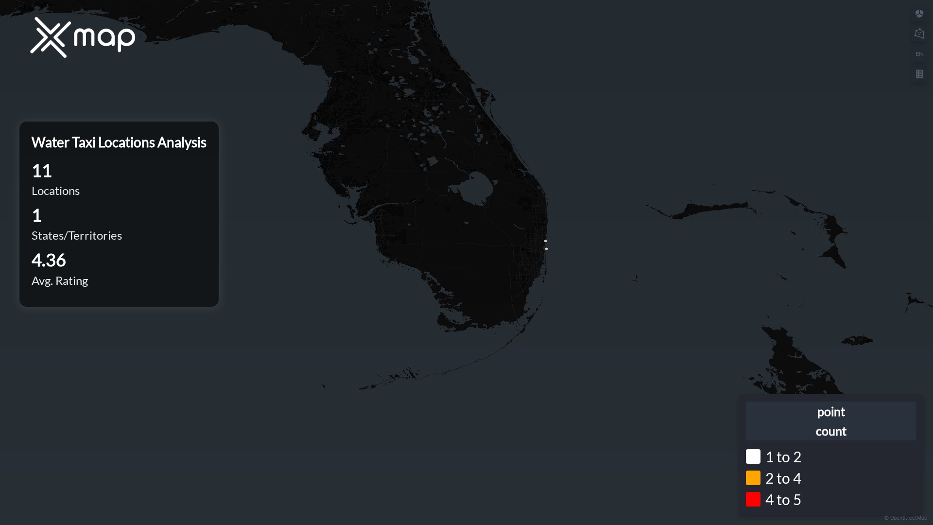 There are 11 Water Taxi locations in the United States of America as of January 27, 2026. The state or territory with the most Water Taxi locations is Florida, with 11 sites, accounting for roughly 100.0% of the total.
