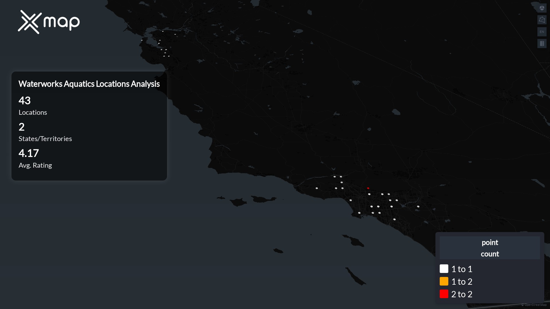 Locations concentrate around major metros such as LosAngeles, Orange, SantaClara, Alameda, and SanDiego. The top 10 cities account for 97.7% of U.S. sites.
