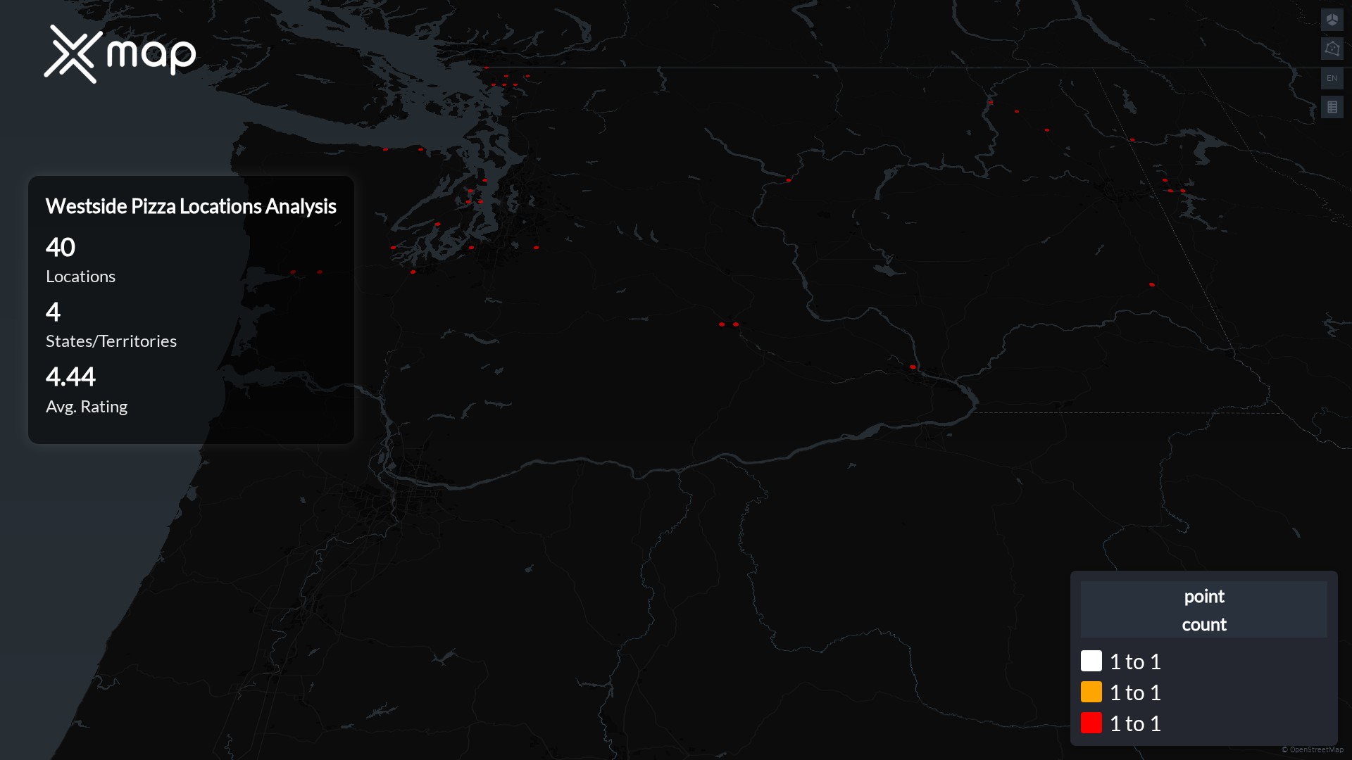 Street-level clusters show corridors where multiple Westside Pizza locations sit within the same neighborhood indicating strong local presence and coherence. Westside Pizza operates a total of 40 nationwide.