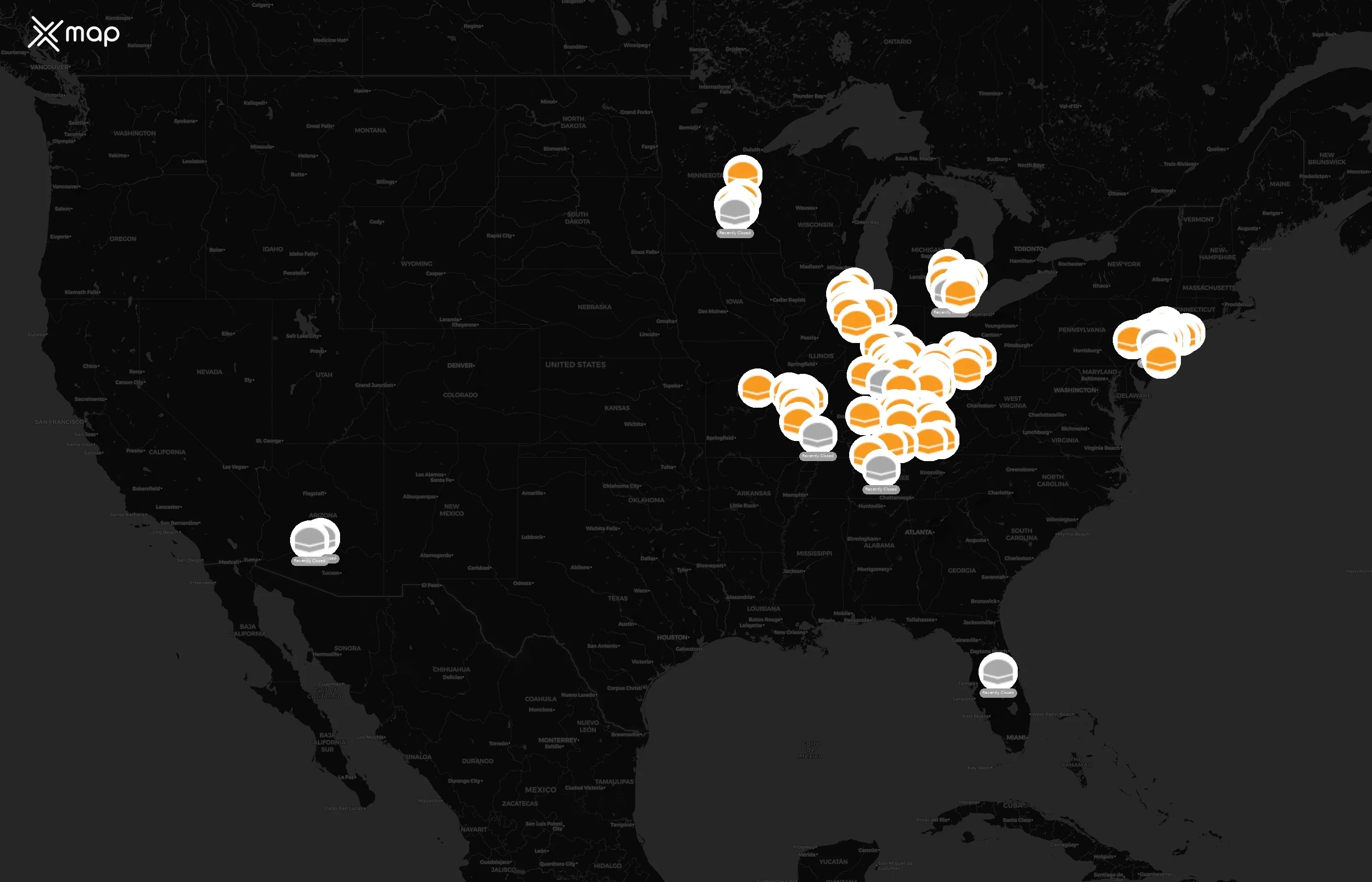 Street-level clusters show corridors where multiple White Castle locations sit within the same neighborhood indicating strong local presence and coherence. White Castle operates a total of 333 nationwide.