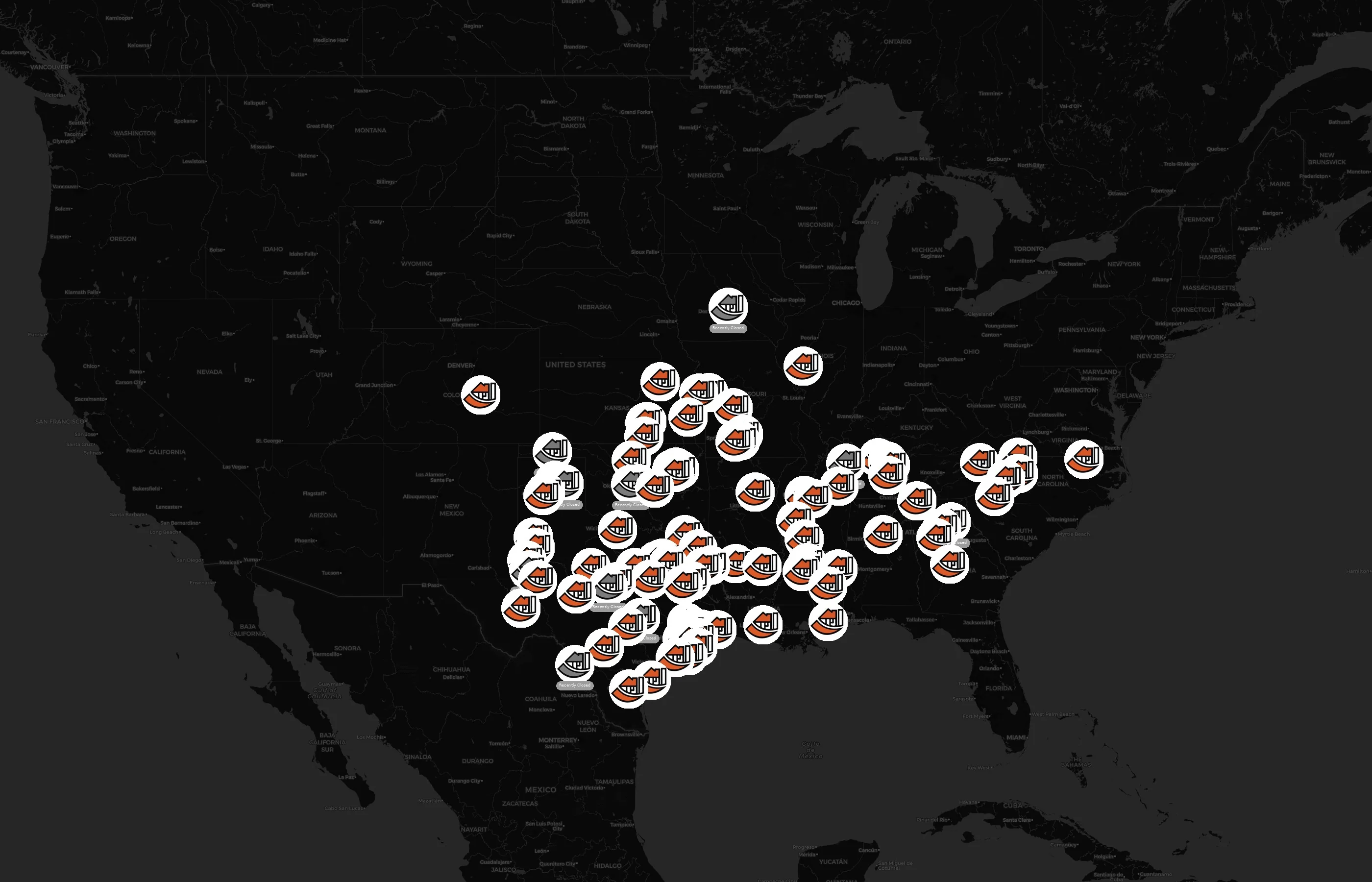 Locations concentrate around major metros such as Harris, Tulsa, Gregg, Dallas, and Canadian. The top 10 cities account for 27.8% of U.S. sites.
