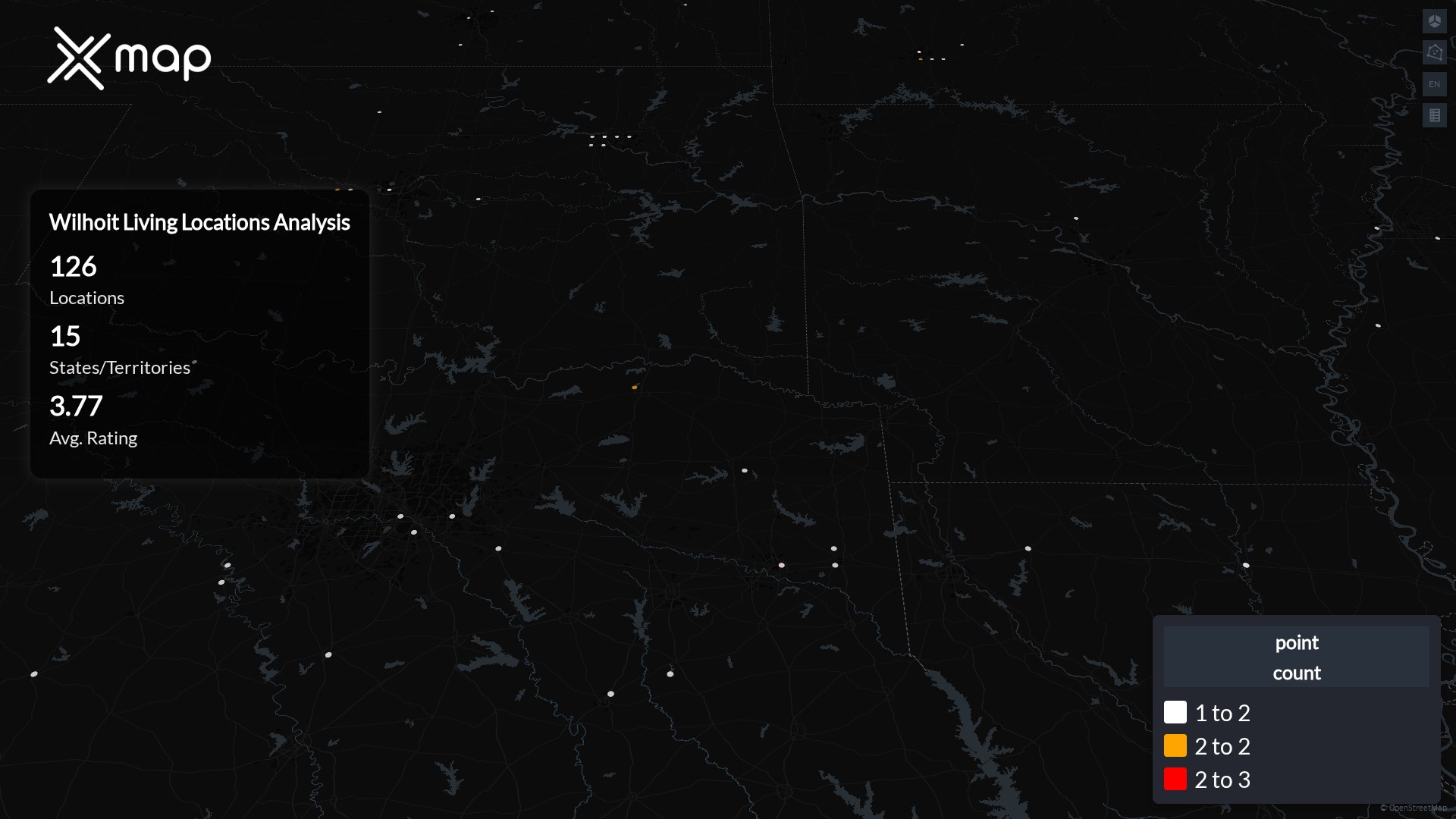 Wilhoit Living operates 126 United States of America locations across 15 states. Largest clusters are in Texas, Oklahoma, and Missouri; the top 10 states contain 95.2% of sites. Coverage is thinner in Illinois, Iowa, and SouthCarolina.