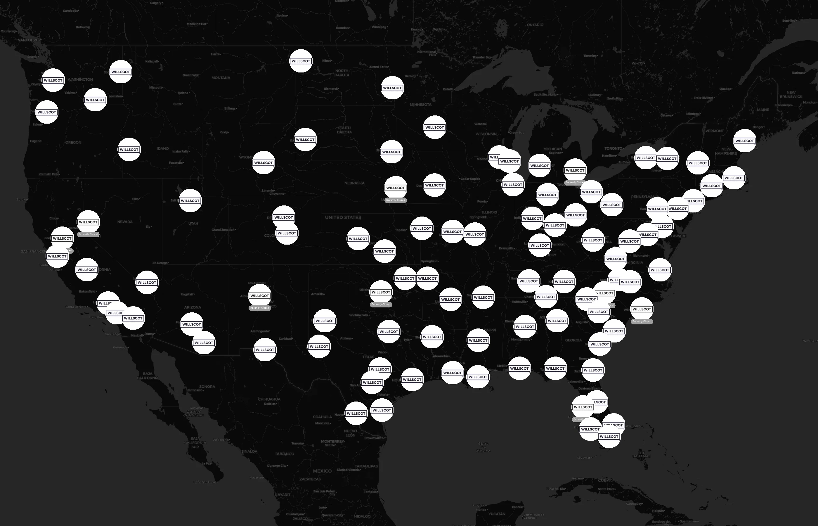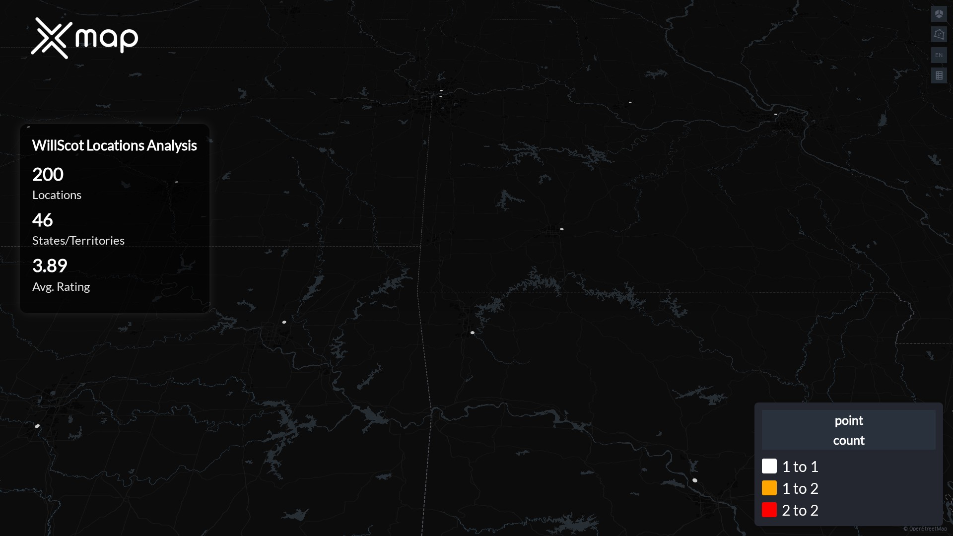 Street-level clusters show corridors where multiple WillScot locations sit within the same neighborhood indicating strong local presence and coherence. WillScot operates a total of 200 nationwide.
