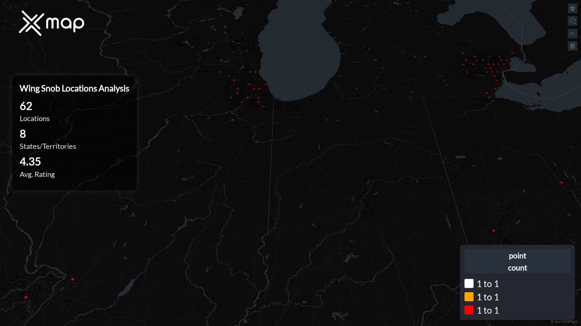 Street-level clusters show corridors where multiple Wing Snob locations sit within the same neighborhood indicating strong local presence and coherence. Wing Snob operates a total of 62 nationwide.