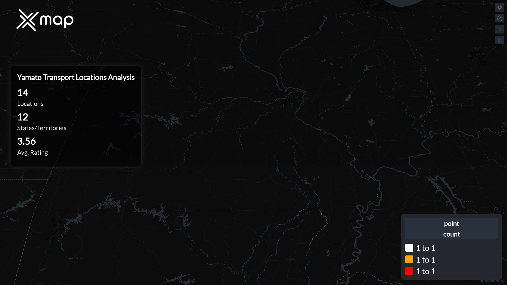 Street-level clusters show corridors where multiple Yamato Transport locations sit within the same neighborhood indicating strong local presence and coherence. Yamato Transport operates a total of 14 nationwide.