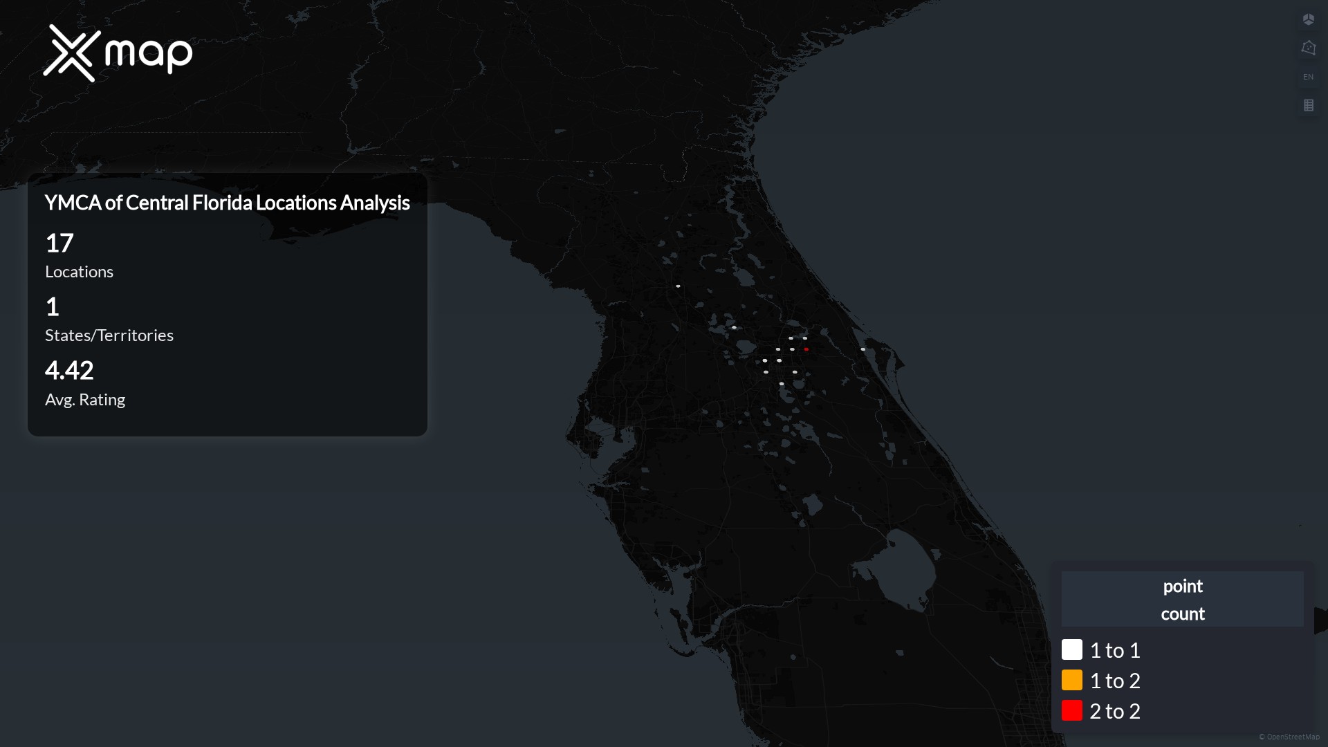 The YMCA of Central Florida operates 17 locations in Florida, with 15 currently open and 2 closed. This results in an 88.2% open rate for the brand within the state.