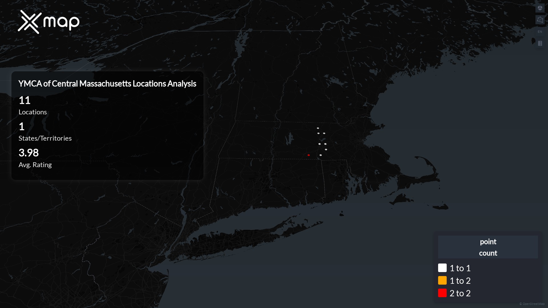 Street-level clusters show corridors where multiple YMCA of Central Massachusetts locations sit within the same neighborhood indicating strong local presence and coherence. YMCA of Central Massachusetts operates a total of 11 nationwide.