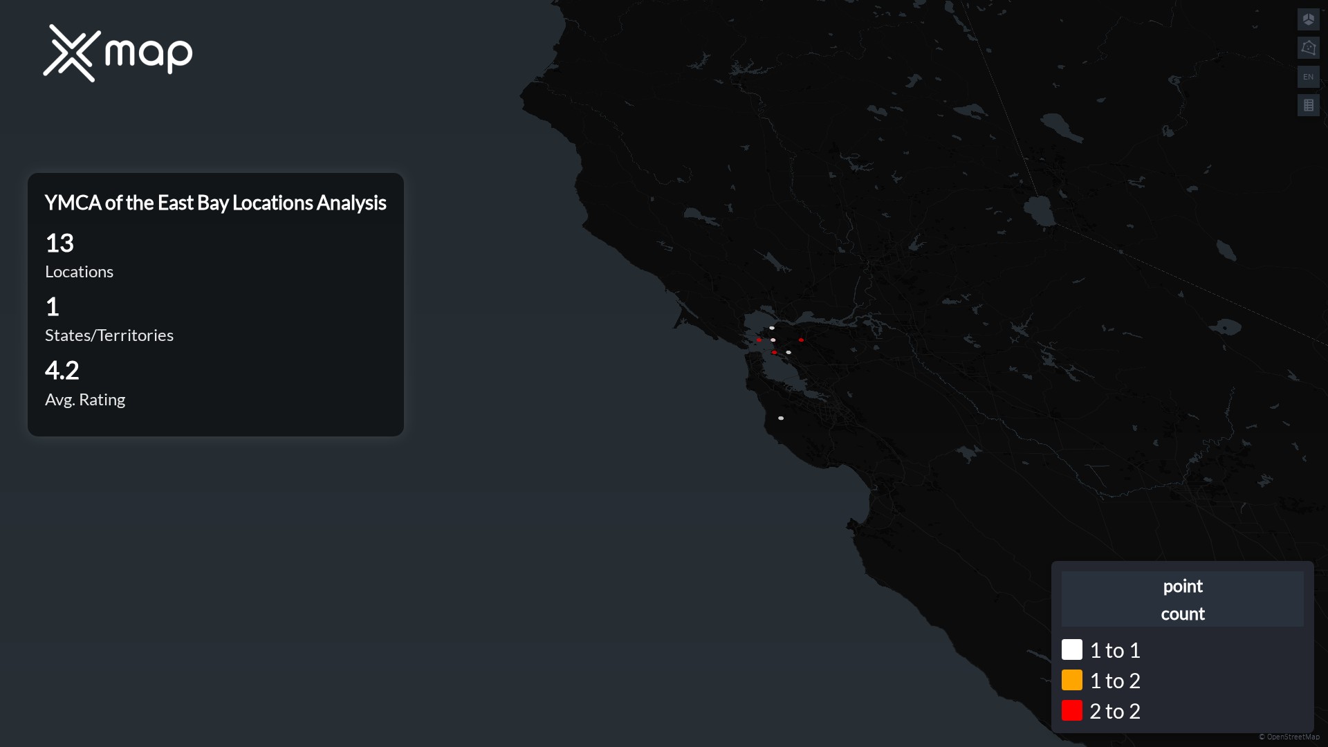 Street-level clusters show corridors where multiple YMCA of the East Bay locations sit within the same neighborhood indicating strong local presence and coherence. YMCA of the East Bay operates a total of 13 nationwide.