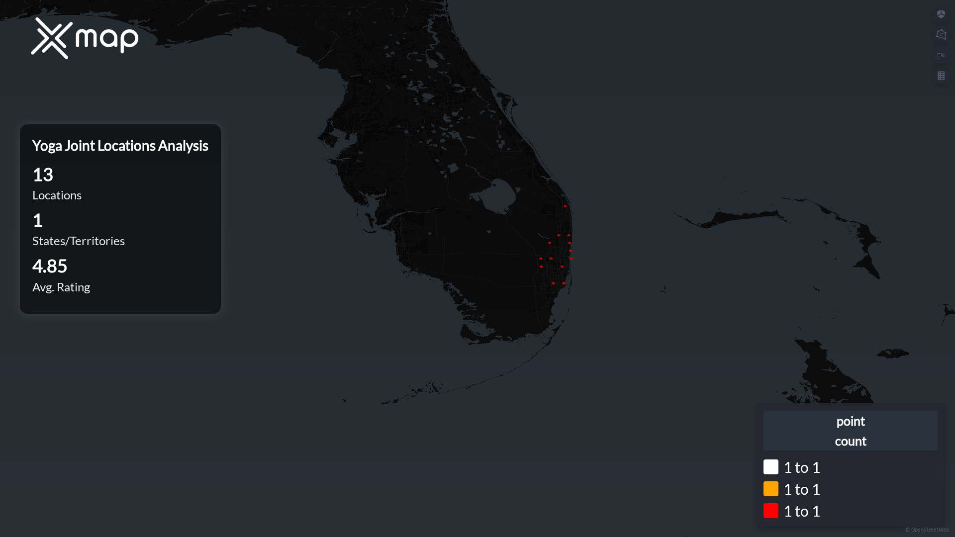Yoga Joint operates 13 United States of America locations across 1 states. Largest clusters are in Florida; the top 10 states contain 100.0% of sites. Coverage is thinner in Florida.