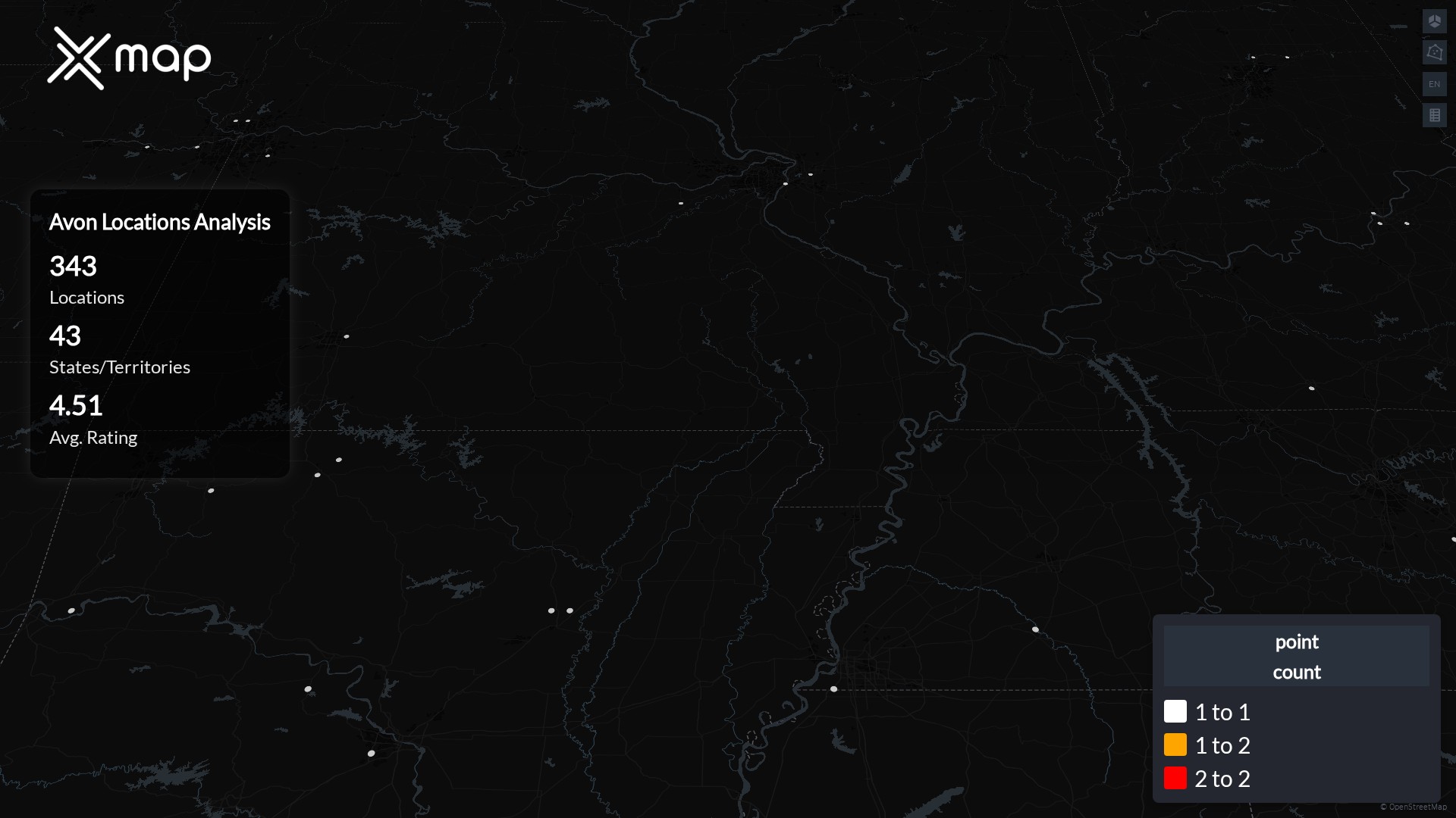 Street-level clusters show corridors where multiple Avon locations sit within the same neighborhood indicating strong local presence and coherence. Avon operates a total of 343 nationwide.