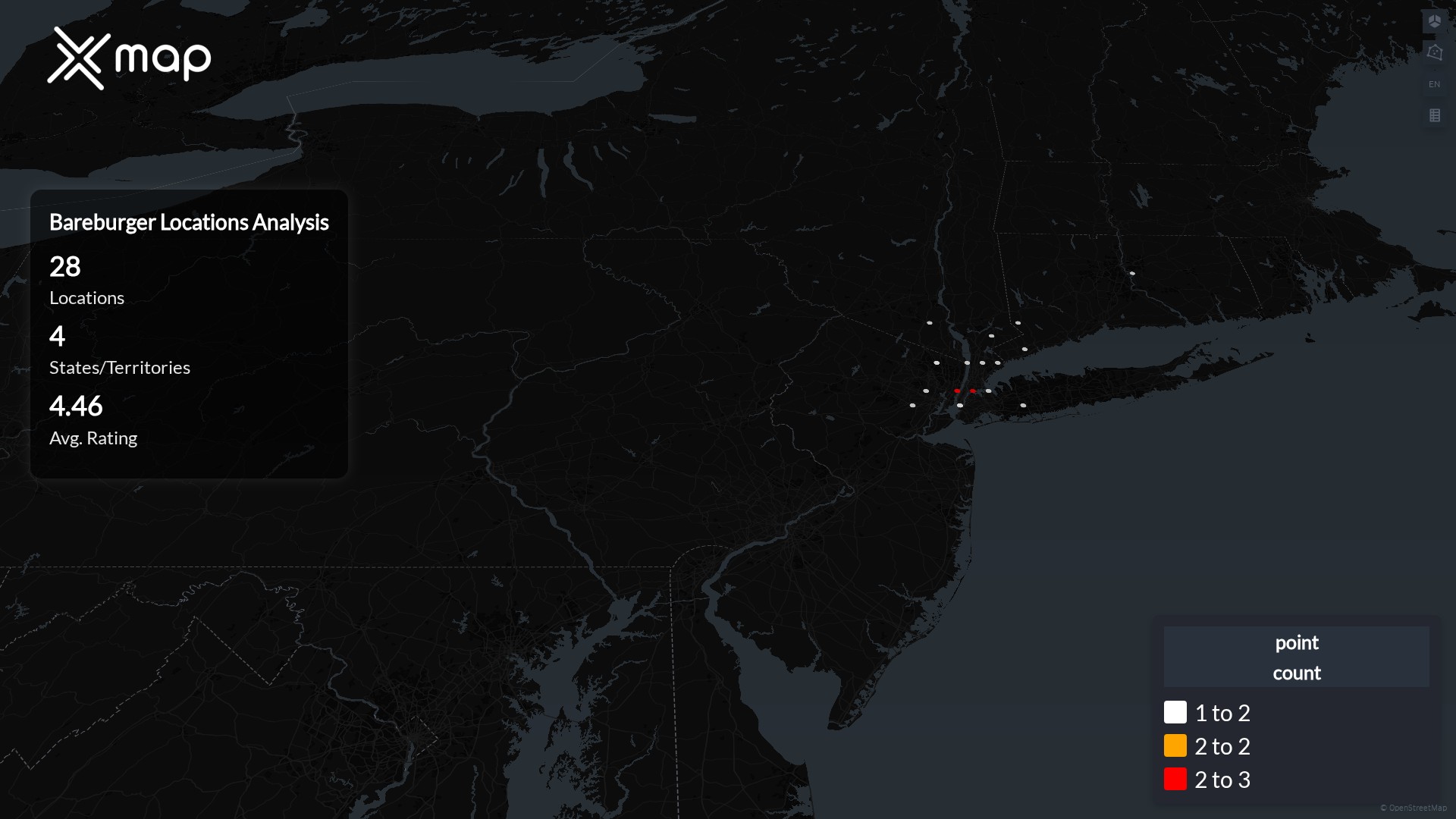 Street-level clusters show corridors where multiple Bareburger locations sit within the same neighborhood indicating strong local presence and coherence. Bareburger operates a total of 28 nationwide.