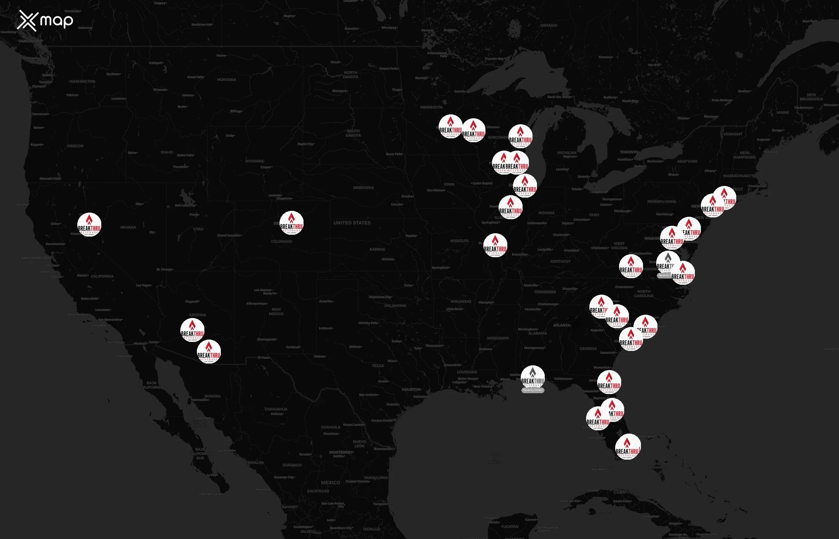 Street-level clusters show corridors where multiple Breakthru Beverage locations sit within the same neighborhood indicating strong local presence and coherence. Breakthru Beverage operates a total of 29 nationwide.