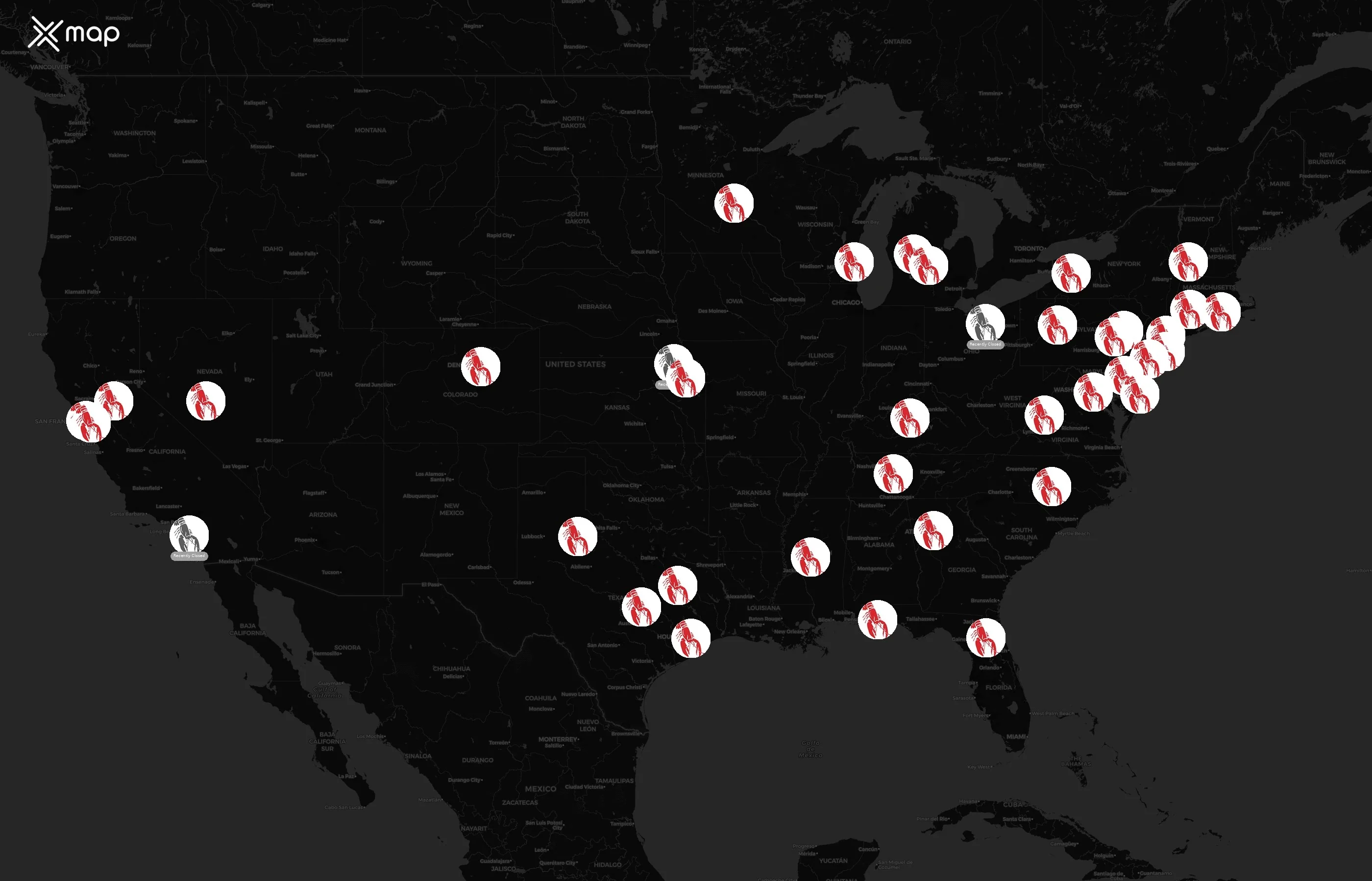 Street-level clusters show corridors where multiple Cousins Maine Lobster locations sit within the same neighborhood indicating strong local presence and coherence. Cousins Maine Lobster operates a total of 38 nationwide.