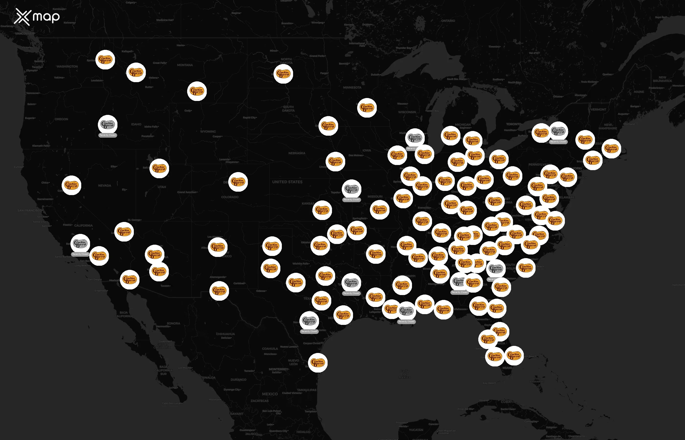 The complete dataset of Cracker Barrel Old Country Store locations across the United States of America is available for download, including coordinates, traffic patterns, and operational status.
