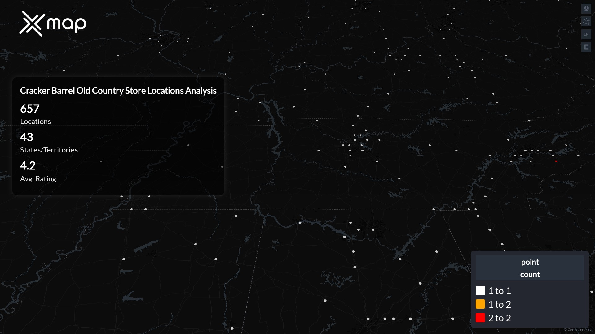 Cracker Barrel Old Country Store has 657 locations across the United States of America. The key variables shows the most infleuntial aspects for Cracker Barrel Old Country Store locations nationwide. This provides a closer look of how Cracker Barrel Old Country Store is operating from different prespectives.