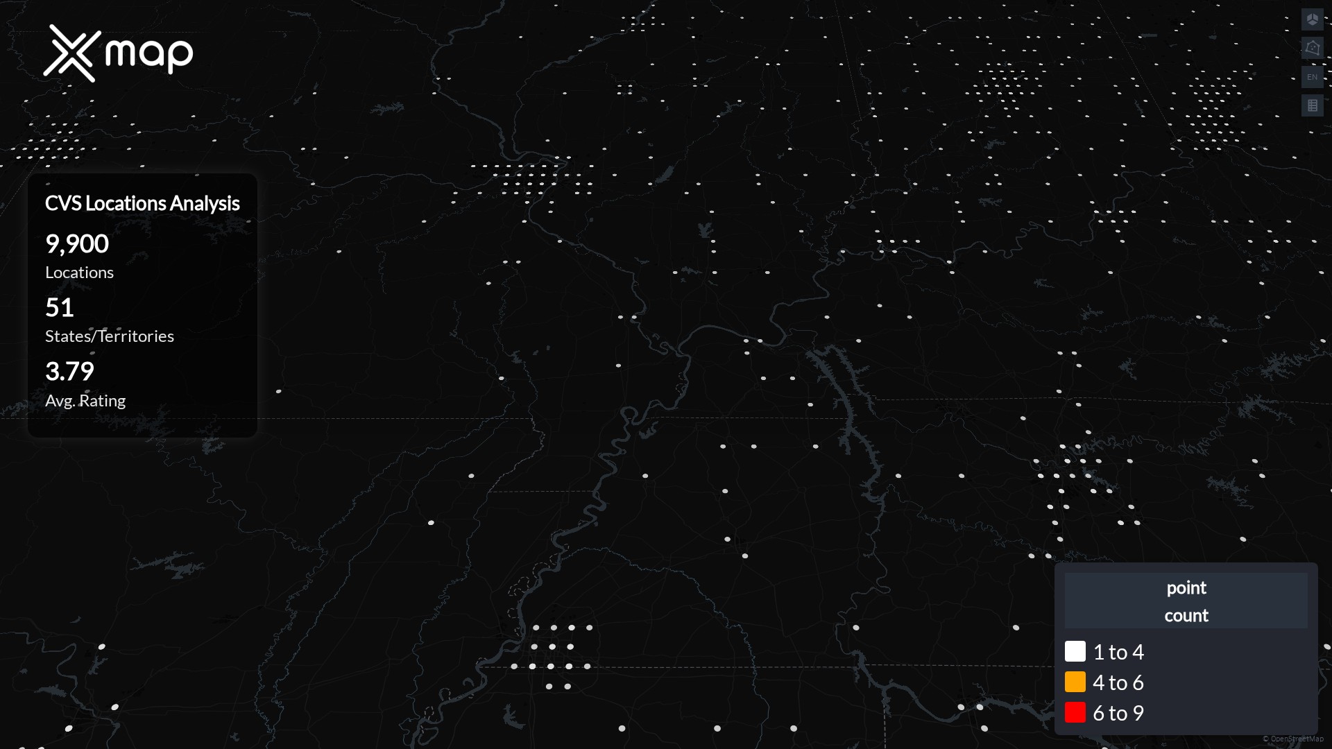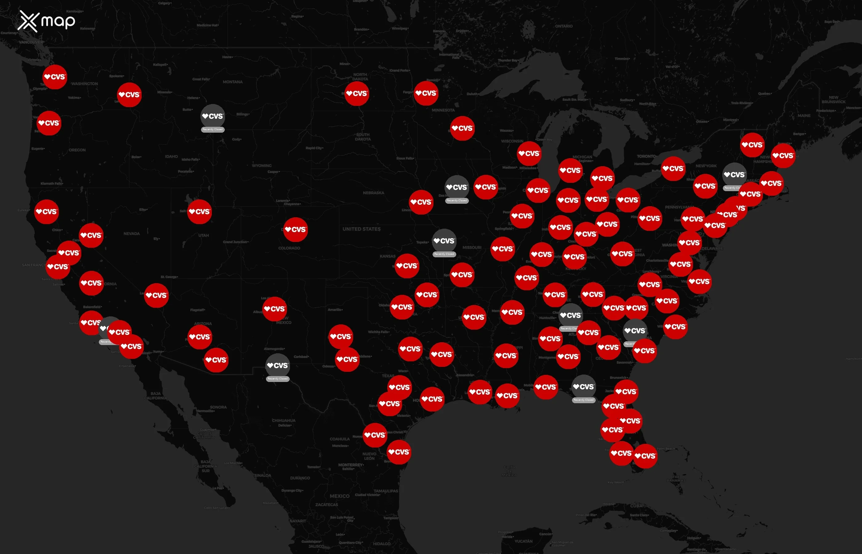 ストリートレベルのクラスターは、同じ近傍内に複数の CVS ロケーションがある廊下を示しており、地域的な存在感と一貫性が強いことを示しています。CVS は全国で合計 9900 か所を運営しています。