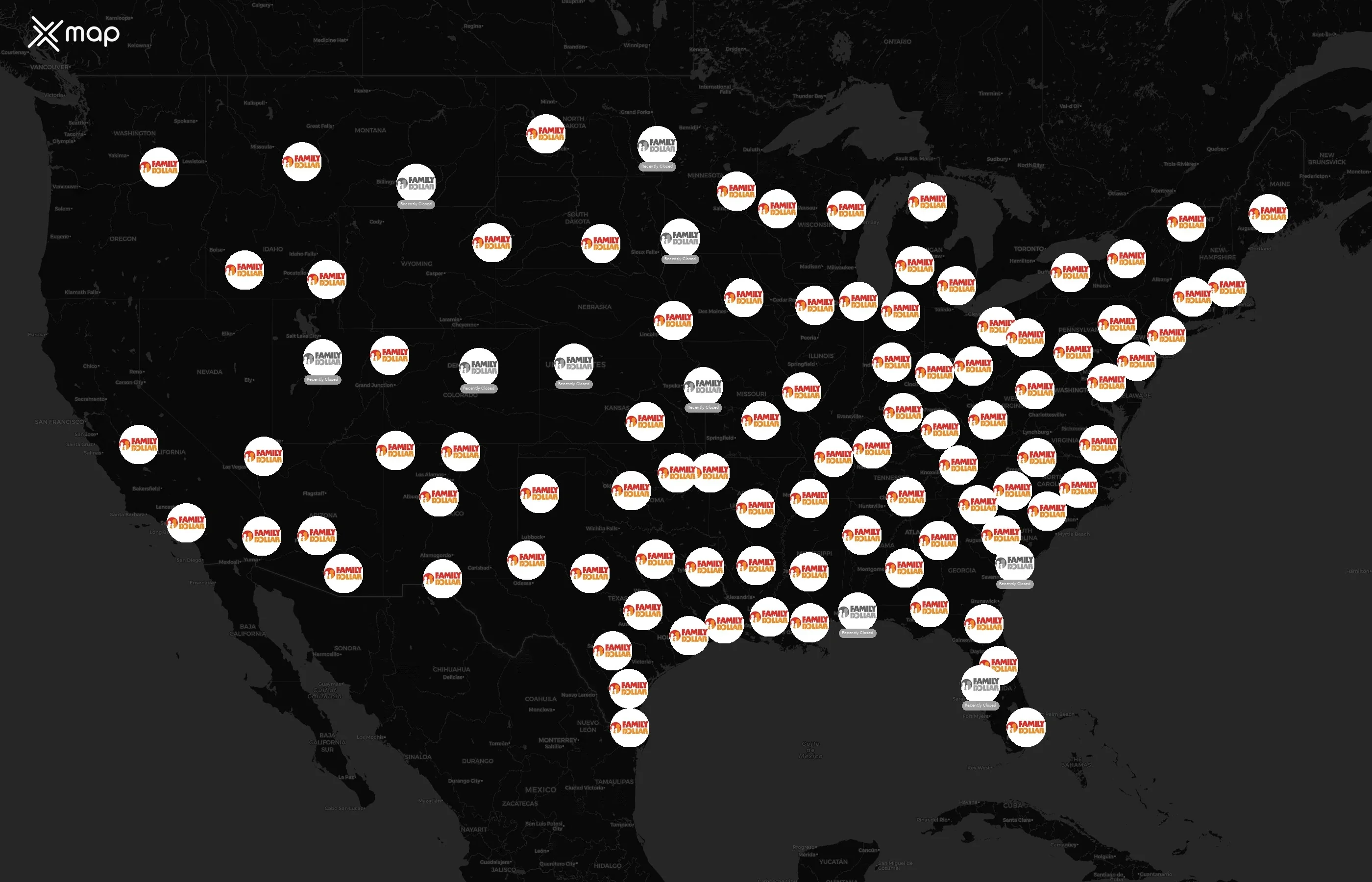 Locations concentrate around major metros such as Houston, Chicago, Dallas, Memphis, and New York. The top 10 cities account for 6.8% of U.S. sites.