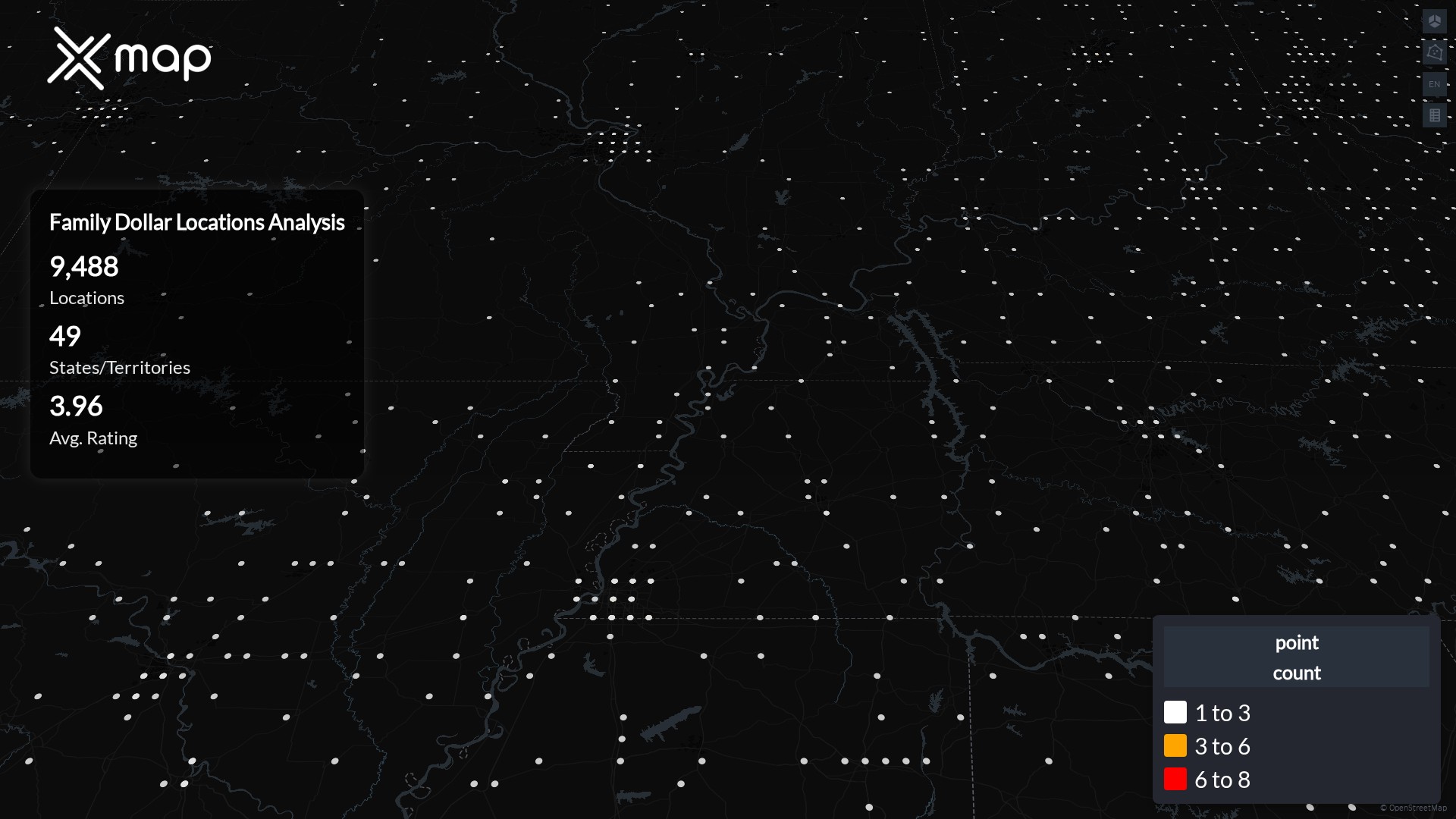 Family Dollar POI data enables clear measurement of footprint and demand. Analysts can rank states and cities by location count, compare coverage on a per-capita basis, and use traffic scores and review volumes to spot high-performing markets and under-served pockets. The result is an objective view of saturation, growth opportunities, and performance outliers.