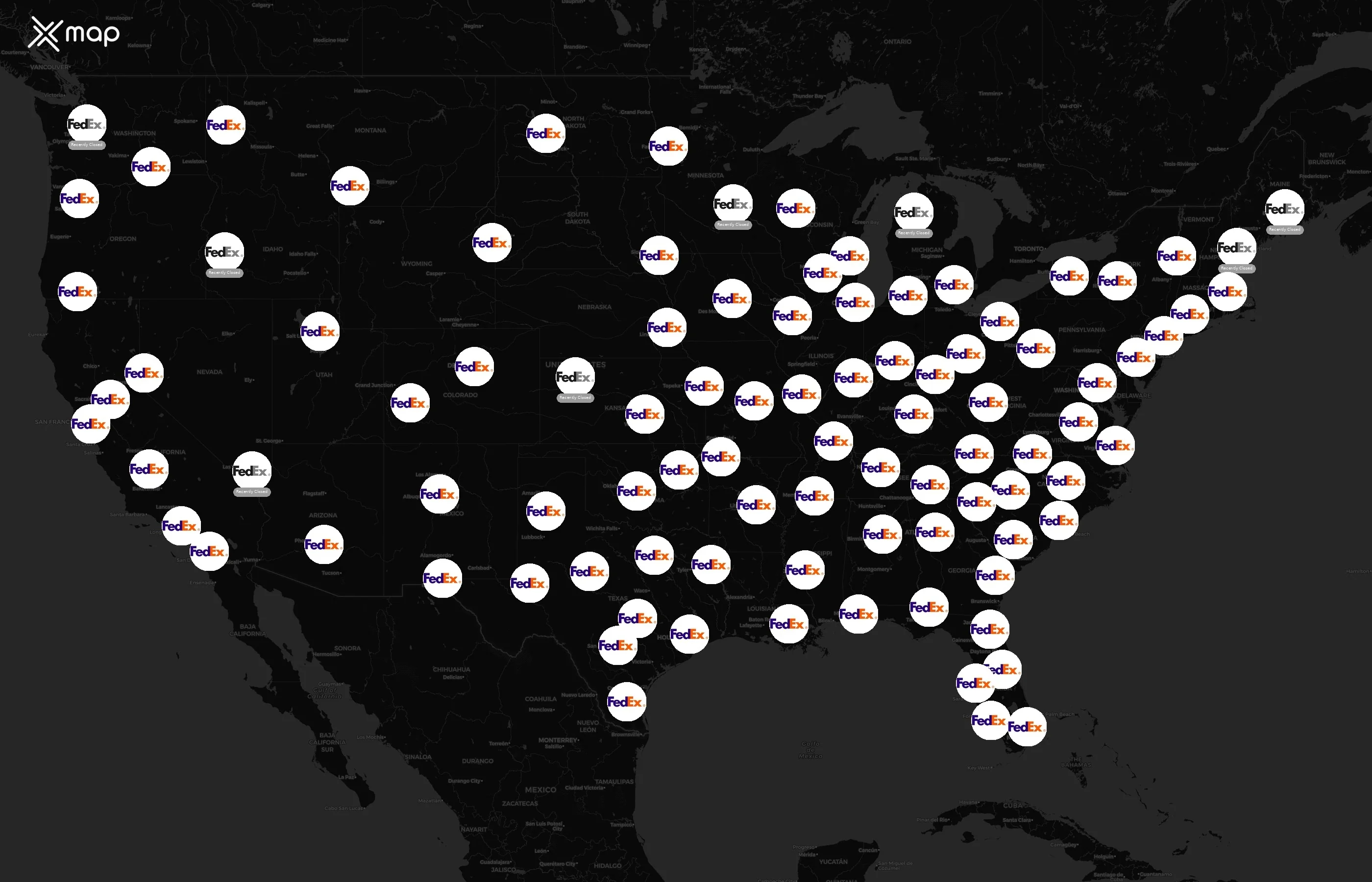 Street-level clusters show corridors where multiple FedEx locations sit within the same neighborhood indicating strong local presence and coherence. FedEx operates a total of 48253 nationwide.